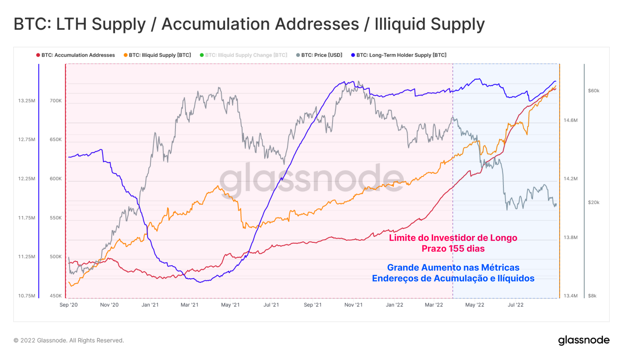 Também podemos comparar o suprimento de LTH com o número de endereços de acumulação e com o suprimento ilíquido para obter uma visão mais abrangente das possíveis mudanças na dinâmica da oferta. Observe que a oferta ilíquida é definida como moedas mantidas em carteiras com pouco ou nenhum histórico de gastos. Endereços de acumulação são aqueles que receberam mais de dois pagamentos, mas nunca gastaram.