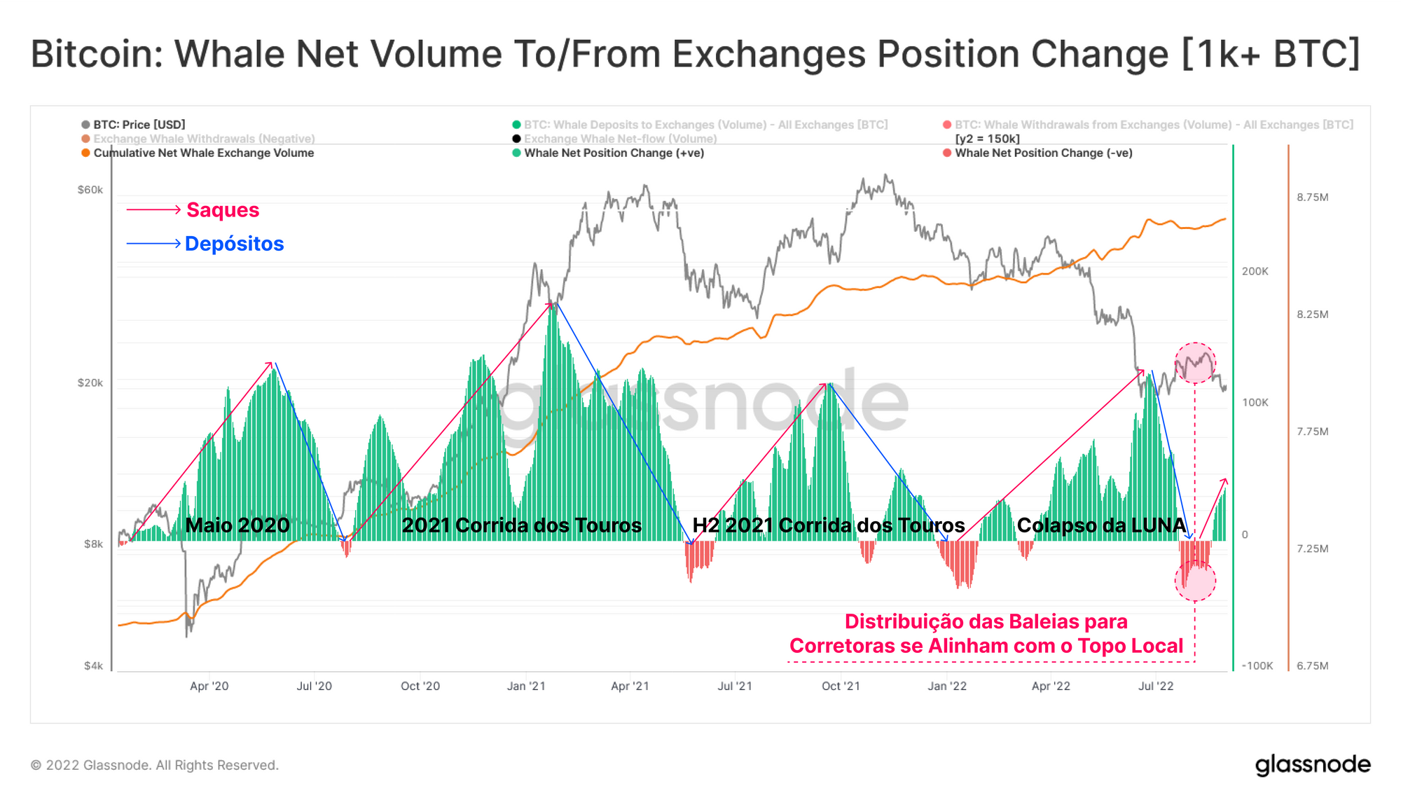 Podemos confirmar esse comportamento usando a métrica "Whale-Exchange Net Position Change". Essa ferramenta nos permite ver a variação líquida de 30 dias nos saldos das Baleias (1k BTC+), considerando apenas moedas entrando e saindo das corretoras.