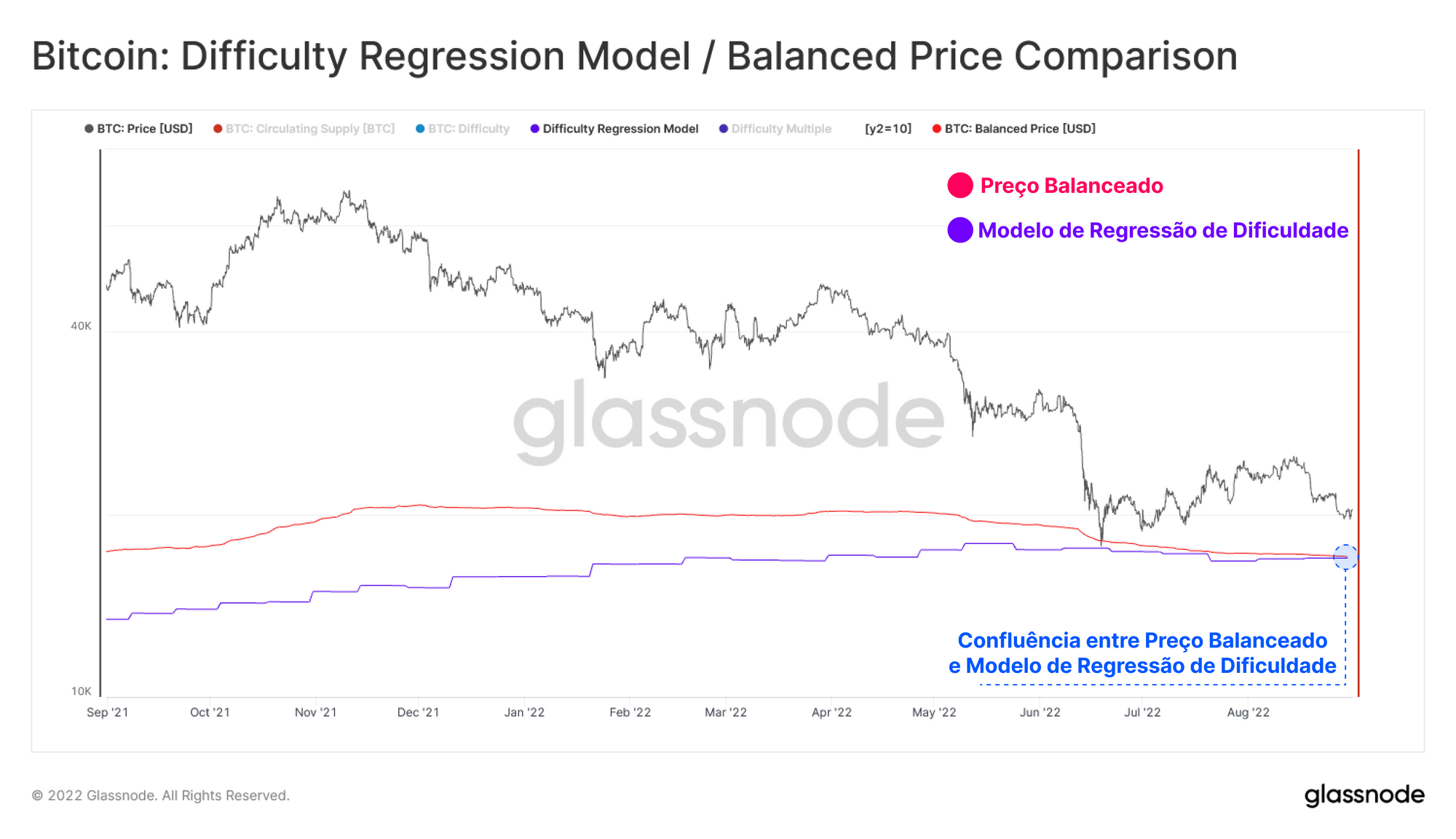 - O Preço de Regressão de Dificuldade tenta modelar o custo total de produção para mineração de Bitcoin, calculado executando um modelo de regressão log-log entre Dificuldade e Valor de Mercado.