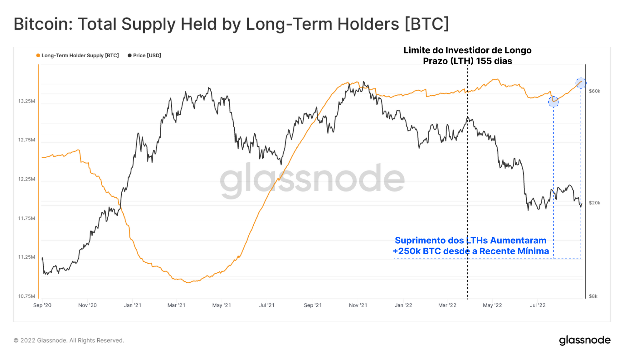 Avaliando o período de novembro de 2020 até os dias atuais, podemos observar que o comportamento macro do HODLing está em alta de vários anos, atingindo 70 mil BTC/mês e alinhando-se a uma convicção de longo prazo (mesmo que a ação do preço permaneça terrível).