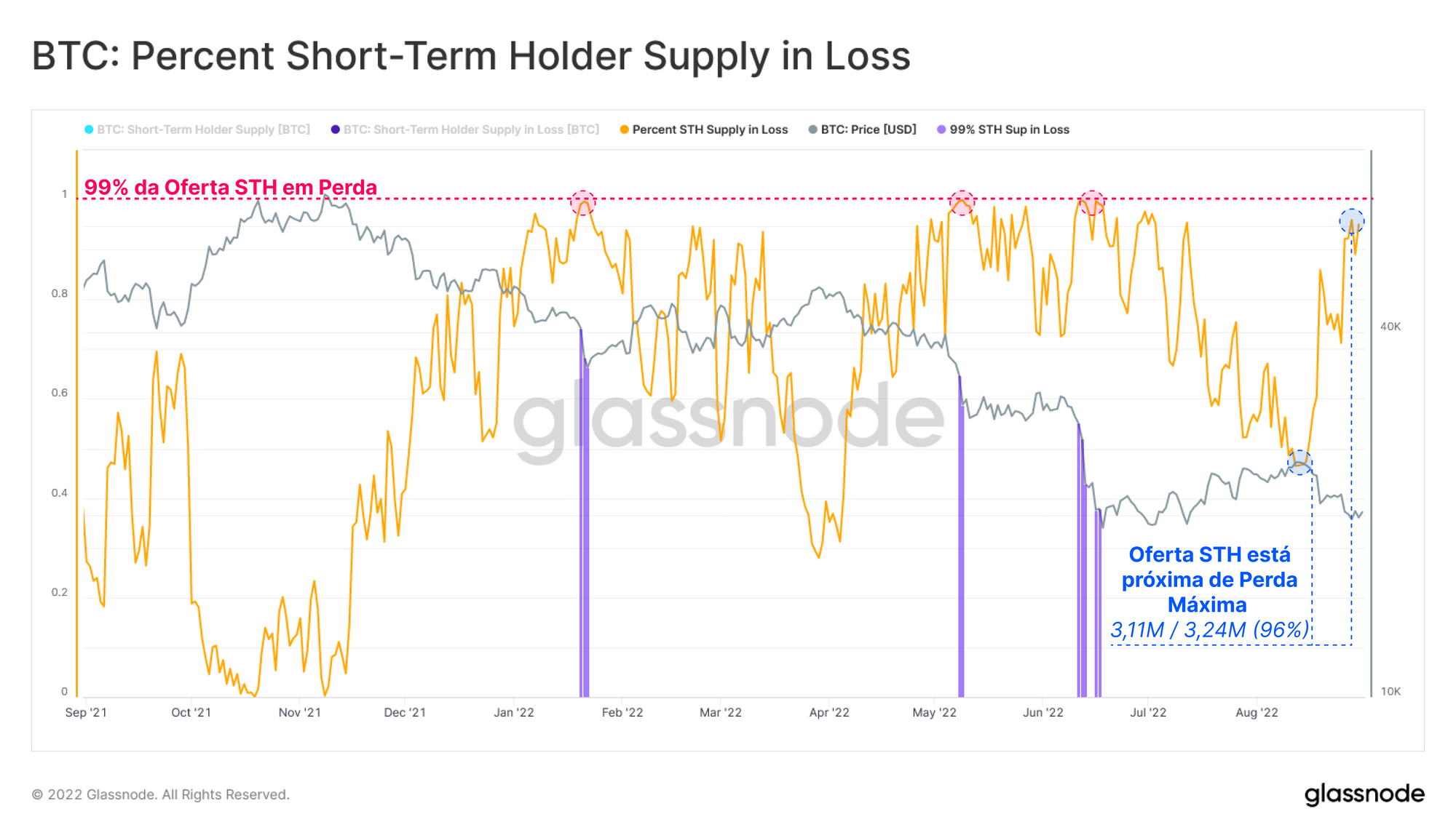 Isso traz o suprimento de STH em perda quase à saturação total, com 96% do suprimento de STH agora submerso em suas propriedades. A saturação de perda total ocorreu três vezes dentro da tendência de baixa predominante, que marcou de forma interessante eventos locais de formação de fundo. Na verdade, isso é resultado da capitulação, pois os vendedores transferem moedas para novos compradores de STH, que colocam um fundo local e depois retornam ao lucro após qualquer recuperação significativa de preço.