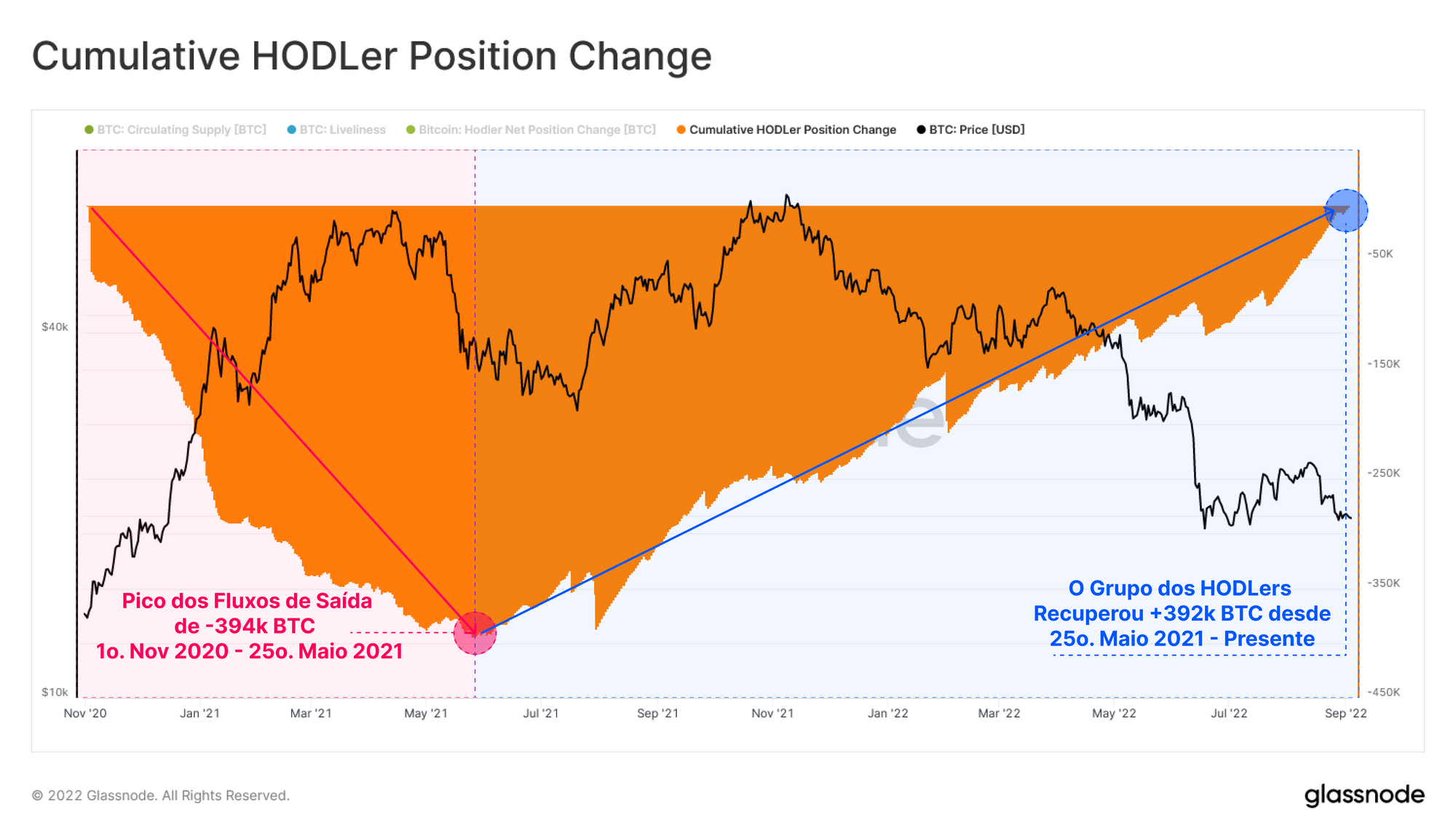 - Fase 2: De Maio 2021 até o Momento, fluxo de entrada acumulado de +394k BTC pode ser observado, efetivamente reabastecendo a fase de distribuição anterior.