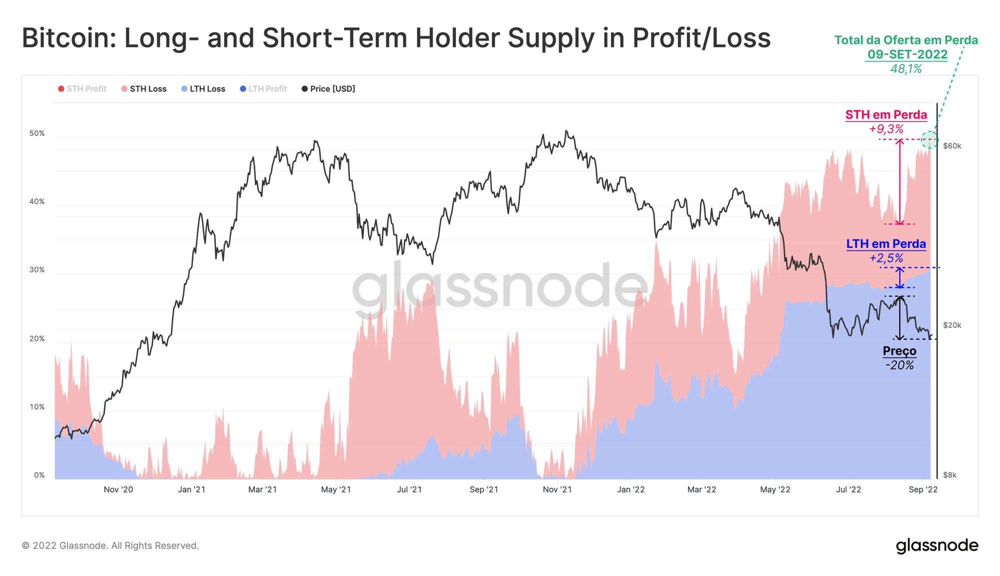 Desde meados de agosto, o mercado vem sendo negociado em baixa desde a máxima da consolidação, que atingiu um pico de cerca de US$ 24,5 mil. À medida que o mercado atinge a faixa mínima desta faixa, temos a oportunidade de observar o volume de moedas que passou de um lucro não realizado (em US$ 24,5 mil) para uma perda não realizada por meio desse processo. Esses momentos fornecem informações valiosas sobre o grau de acumulação de moedas e concentração de base de custo dentro de uma faixa de consolidação estabelecida.