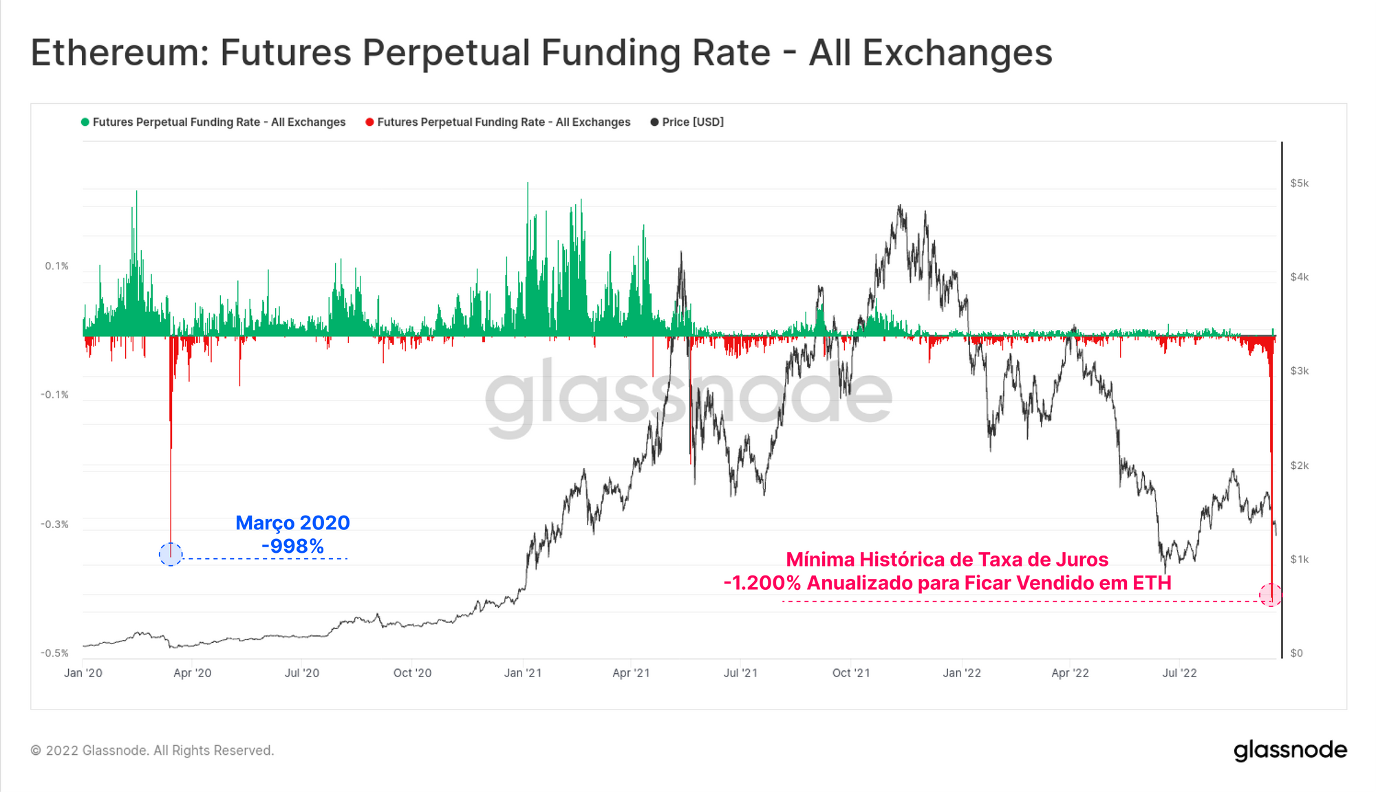 Até a fusão, os investidores nos mercados de futuros perpétuos estavam pagando 1.200% anualizados em taxas de financiamento para manter suas posições vendidas de ETH. Esta é uma nova mínima negativa na taxa de financiamento, eclipsando o pico anterior de -998% atingido durante a liquidação de março de 2020.