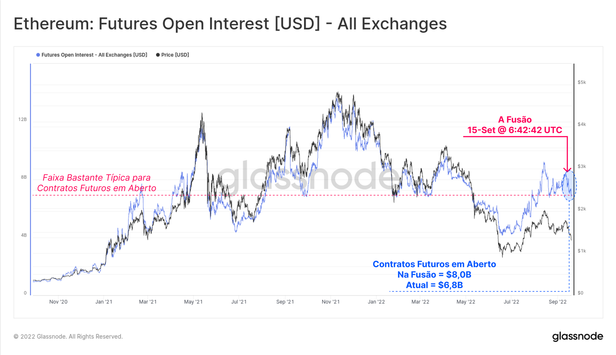 O total de contrato futuros em aberto caiu 15% de US$ 8,0 bilhões para US$ 6,8 bilhões após a Fusão, com esses dois extremos sendo bastante típicos no contexto dos mercados de 2021-22. No entanto, para manter essa mudança no contexto, devemos levar em conta a influência de uma mudança no preço do ETH, que afeta o valor em dólares dos tamanhos das posições futuras denominadas em ETH.