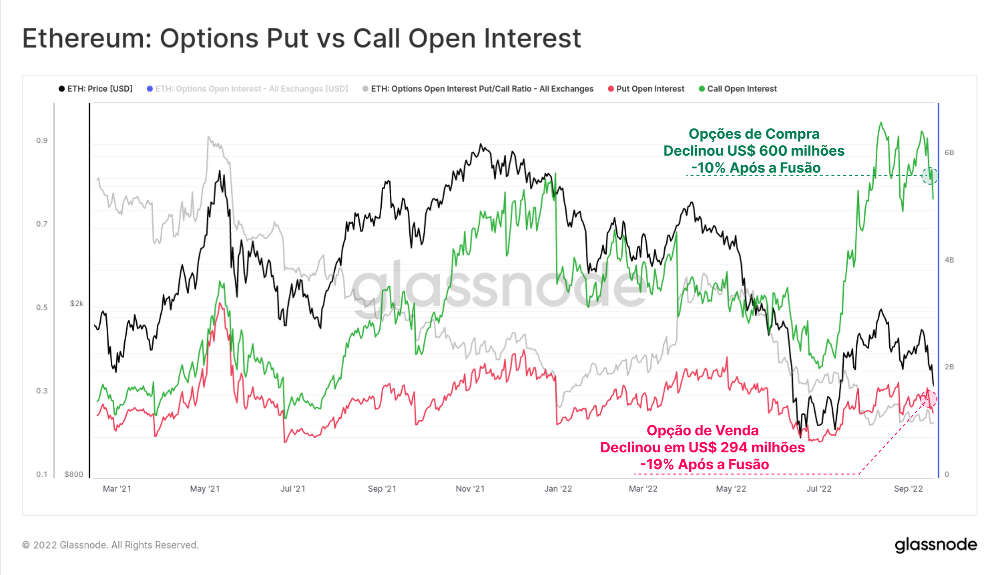 Nos mercados de opções, onde ocorreu uma grande quantidade de especulação recentes de ETH, os contratos em aberto de opção de compra caiu US$ 600 milhões após a Fusão (uma queda de 10%). Permanece um total de US$ 5,2 bilhões em valor de posição de opção de compra em aberto, que ainda é muito superior às valores de 2021. Os mercados de opções de venda experimentaram uma queda relativa mais significativa de 19%, mas isso continua sendo uma escala muito menor de US$ 294 milhões no valor líquido da posição fechada.