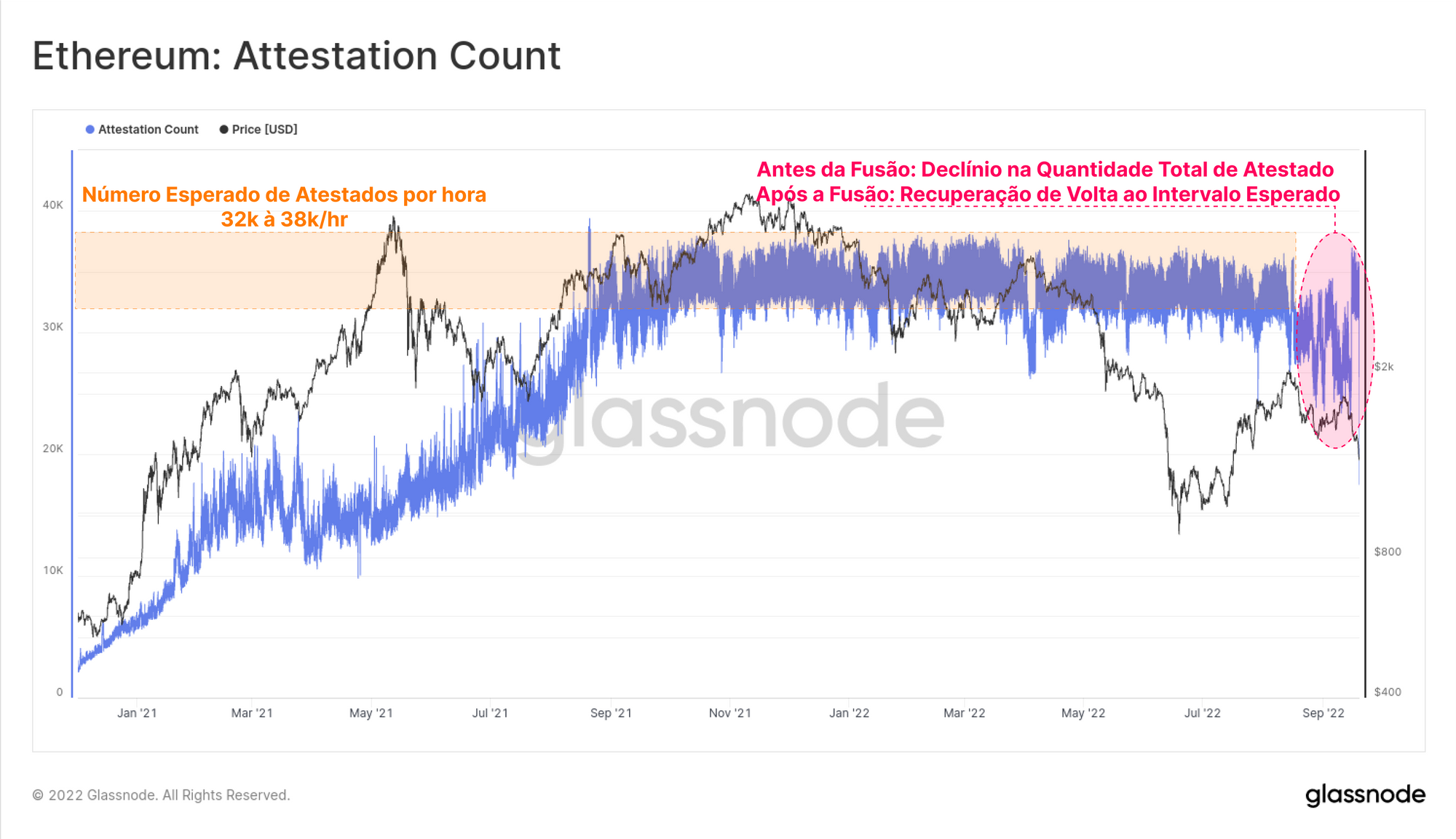 O número de atestados na ponta da cadeia também sofreu um breve declínio antes da Fusão, mas também se recuperou de volta ao intervalo esperado de 32k a 38k atestados/hora. É possível que isso reflita problemas de nó com um operador de participação de tamanho maior, ou talvez um bug de software, onde vários validadores foram afetados em um curto período de tempo.