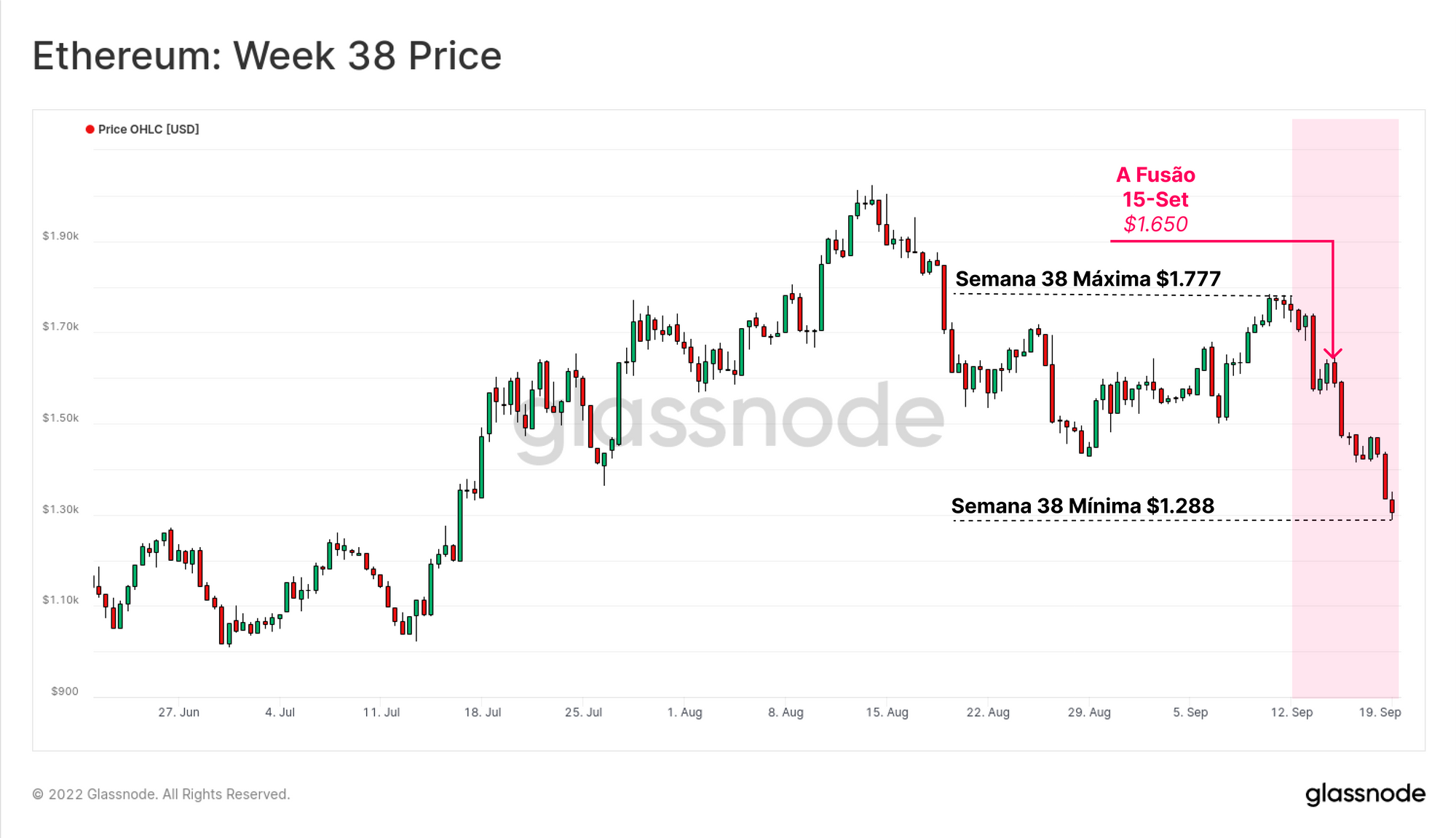 Em nosso Relatório WoC 32, descrevemos como o posicionamento de mercado nos mercados de Futuros e Opções parecia estar bem protegido para um evento no estilo vendendo as notícias. De fato, os preços do ETH foram vendidos, de uma alta semanal de US$ 1.777, para cerca de US$ 1.650 no momento da Fusão, antes de cair para uma mínima de US$ 1.288 no domingo.