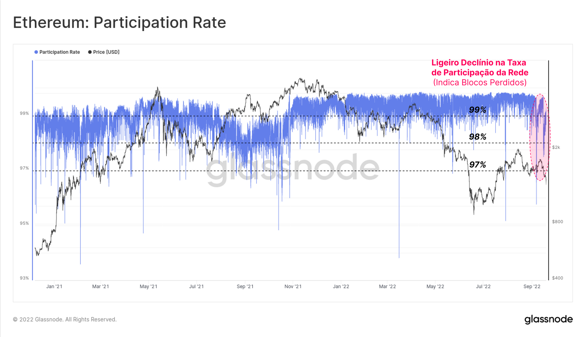 Nas semanas que antecederam a Incorporação, pode-se observar uma ligeira queda na Taxa de Participação, caindo abaixo do nível típico de 99% para cerca de 97,5%. Após a Fusão, isso foi revertido para a faixa de 99%+, sugerindo apenas uma breve interrupção para algum subconjunto de validadores.