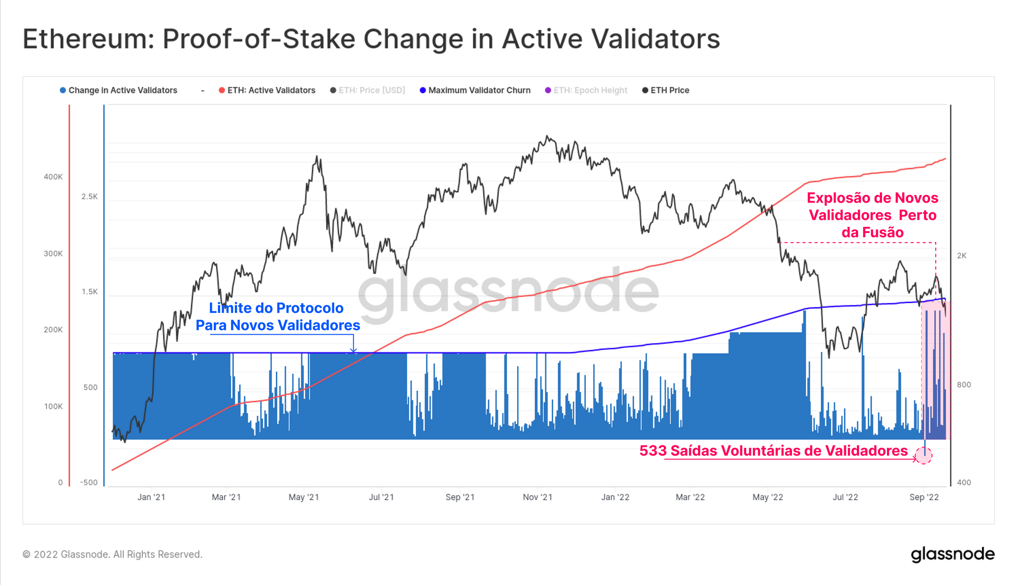 Atualmente, a Ethereum possui mais de 429,6 mil validadores ativos na rede. O gráfico abaixo mostra os últimos 6 meses, onde o gradiente de novos validadores aumentou acentuadamente antes e após a Fusão. Mais de 11,36 mil validadores entraram em operação somente em setembro, significando uma crescente confiança dos investidores à medida que os desafios técnicos da Fusão foram eliminados.