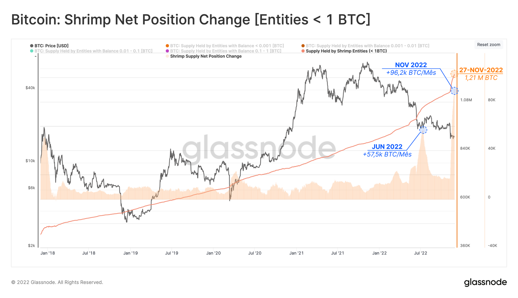 Entre todos os grupos, as entidades com menos de 1 BTC (também rotuladas como Camarões🦐) registraram duas ondas distintas de aumento de saldo nos últimos 5 meses marcando novos ATHs. Os camarões adicionaram +96,2 mil BTC às suas participações desde o colapso do FTX e agora detêm mais de 1,21 milhão de BTC, equivalente a 6,3% não triviais da oferta circulante.