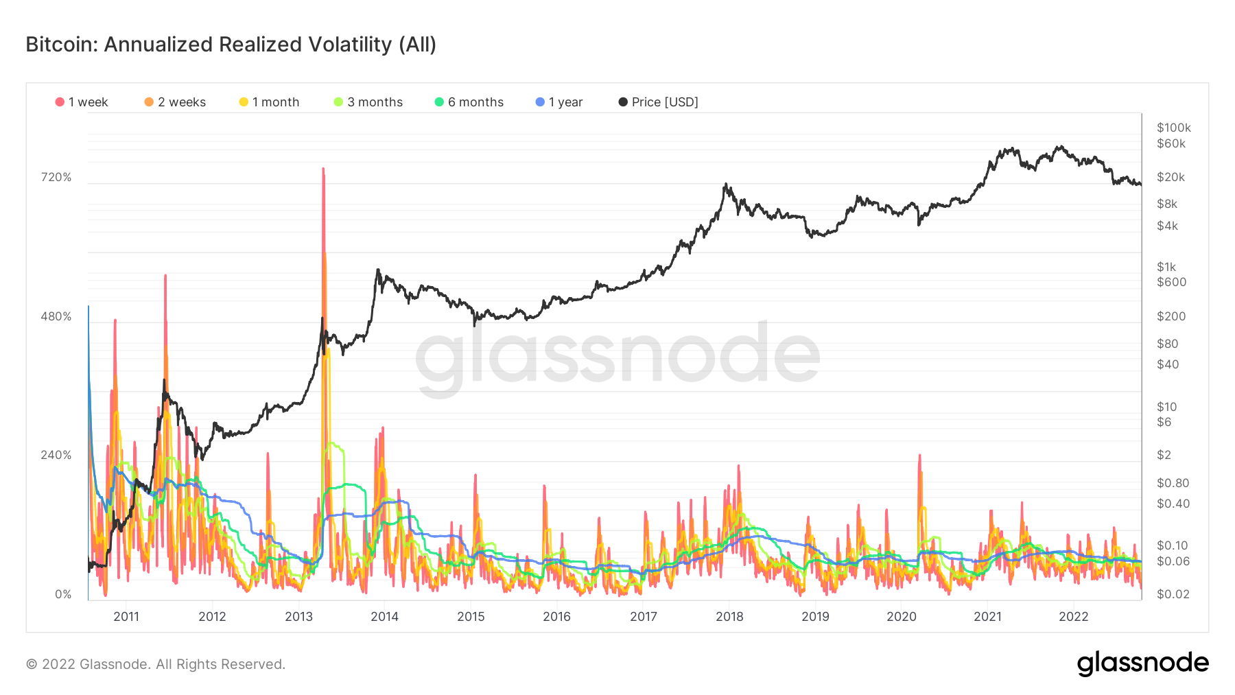 This month, we have released a new suite of Realized Volatility metrics. Realized volatility can be considered as the standard deviation of returns from the mean return of a market. High values in realized volatility indicate a phase of high risk in that market.