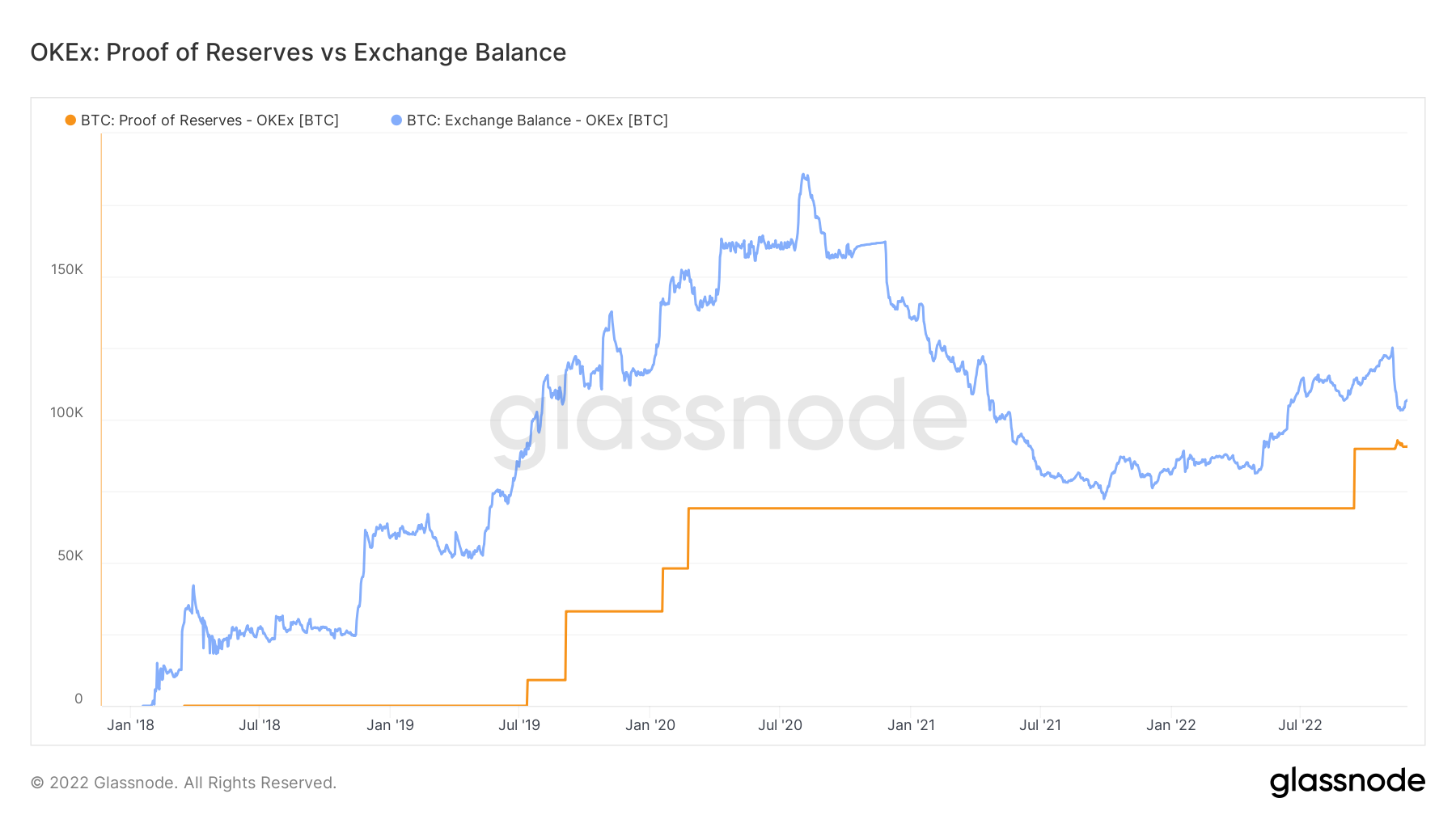 Exchange Balances are often more dynamic as they represent a more comprehensive set of addresses, while proof-of-reserve addresses are often only a small subset of (cold) wallets. Below is an example for OKEx, showing Exchange Balances in blue, and Proof-of-Reserves in orange for BTC.