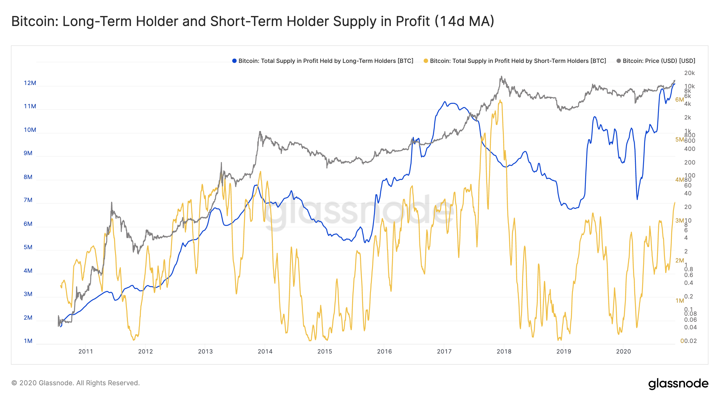 Currently, 12 million BTC of the LTH supply (~97%) and 3.5 million of the STH supply (~97%) are in a state of profit.