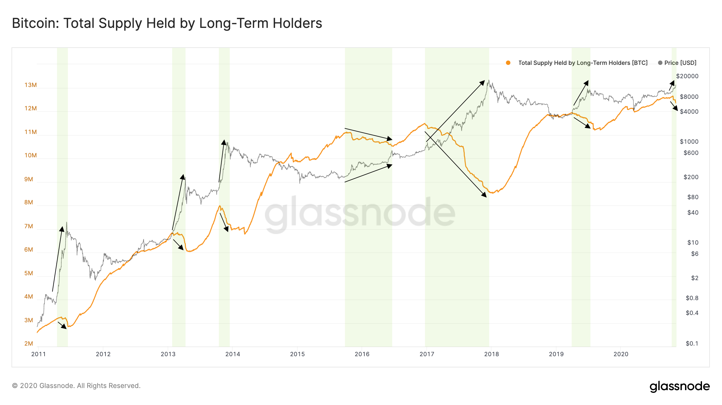 The absolute LTH supply numbers in Figure 3 above include not only hodled coins, but also coins that have been lost. LTH Net Position Change on the other hand eliminates the contribution from lost coins, as it depicts relative numbers by computing the 30 day changes in LTH supply.