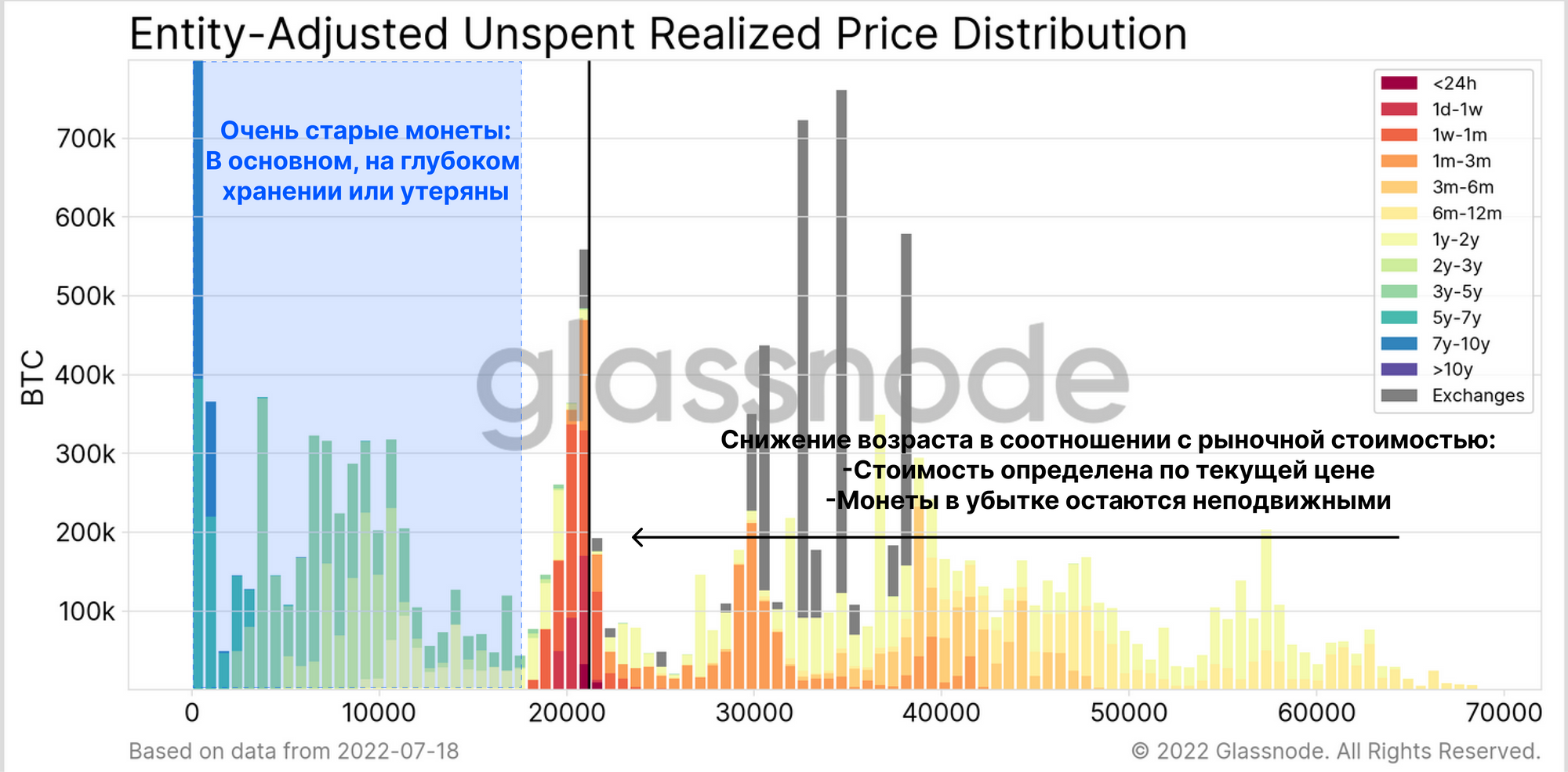 Рассматривая показатель URPD по возрасту группы, мы можем наблюдать распределение предложения биткоина по времени с момента последней транзакции с монетами. Есть два основных момента, которые нужно учитывать: