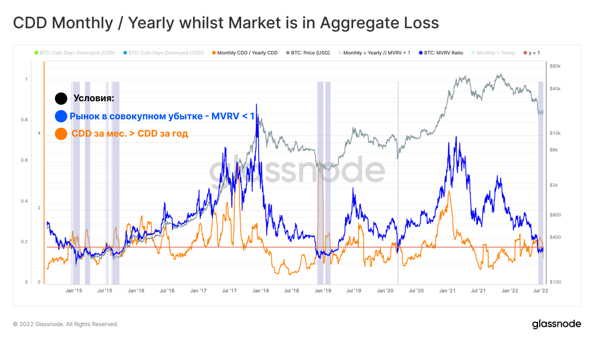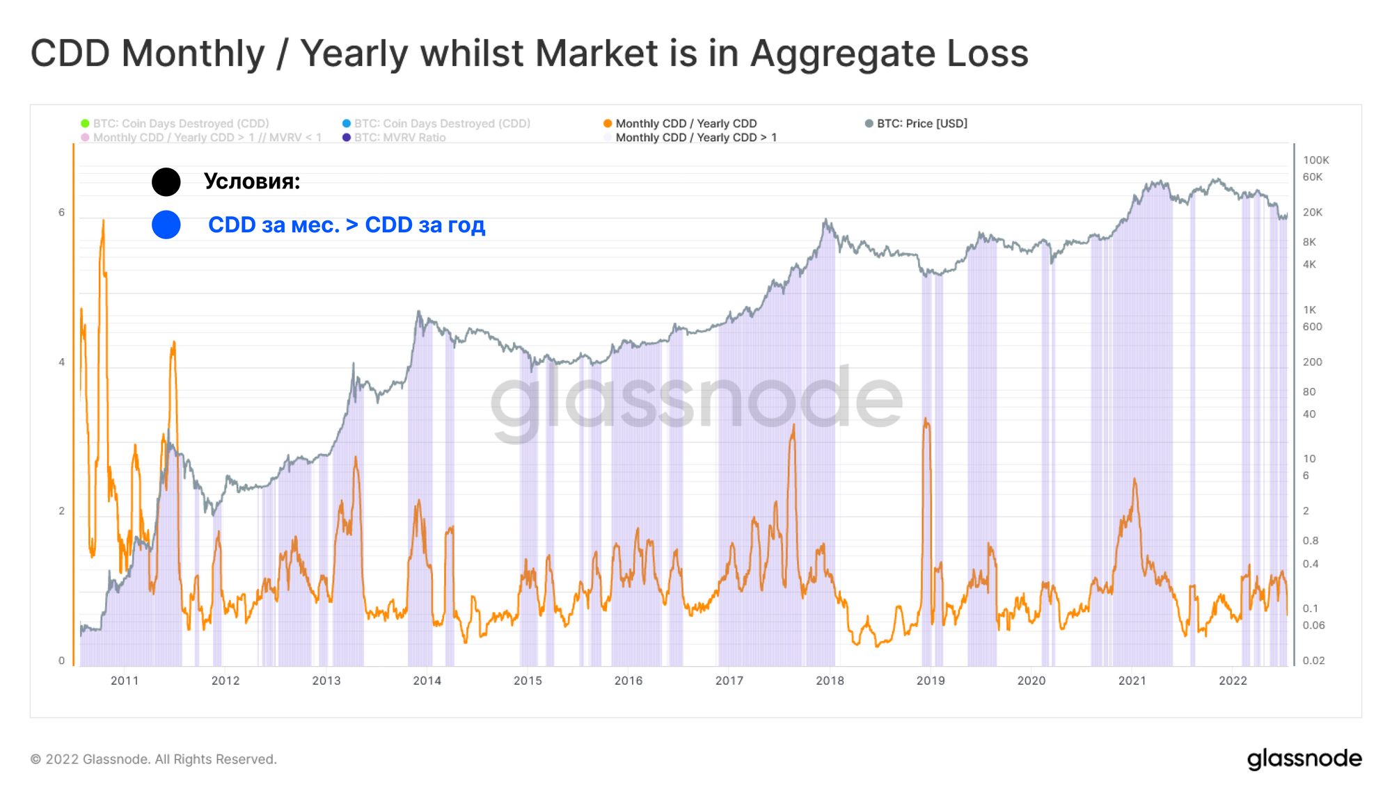 - Повышенные значения осциллятора CDD выше 1, в то время как рынок находится в совокупном убытке (MVRV ниже 1), как правило, совпадают с периодами капитуляции.