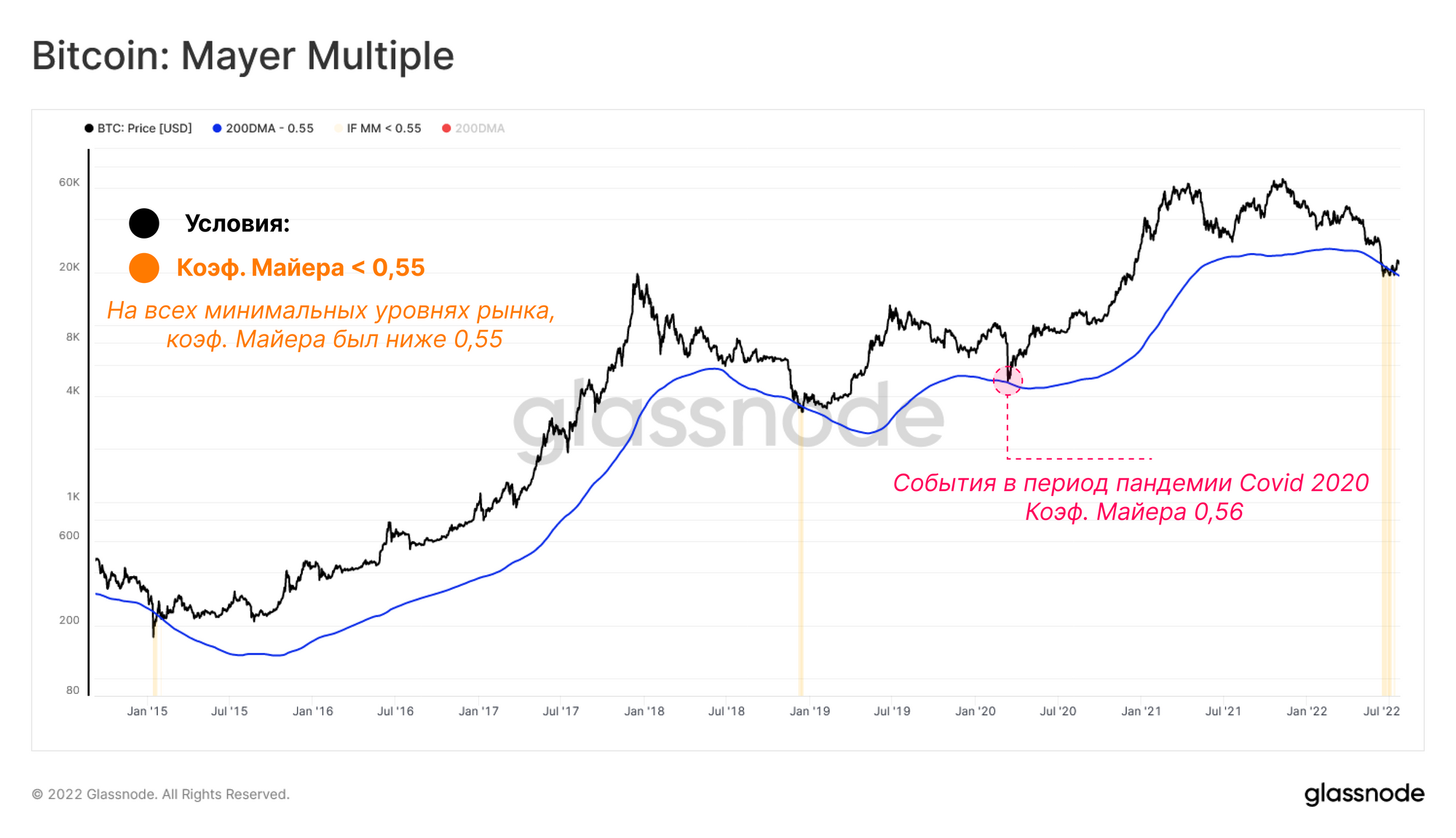 В самом исключительном случае, в период текущей ценовой коррекции коэффициент Майера опускался ниже 0,55, сигнализируя о том, что цены на рынке торговались с дисконтом в 45% по отношению к показателю 200DMA. Такие события крайне редки и составляют всего 127 из 4186 дней, что составляет в общей сложности 3% от всей истории торгов.