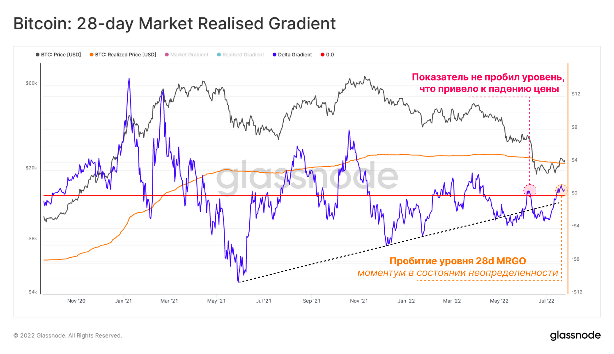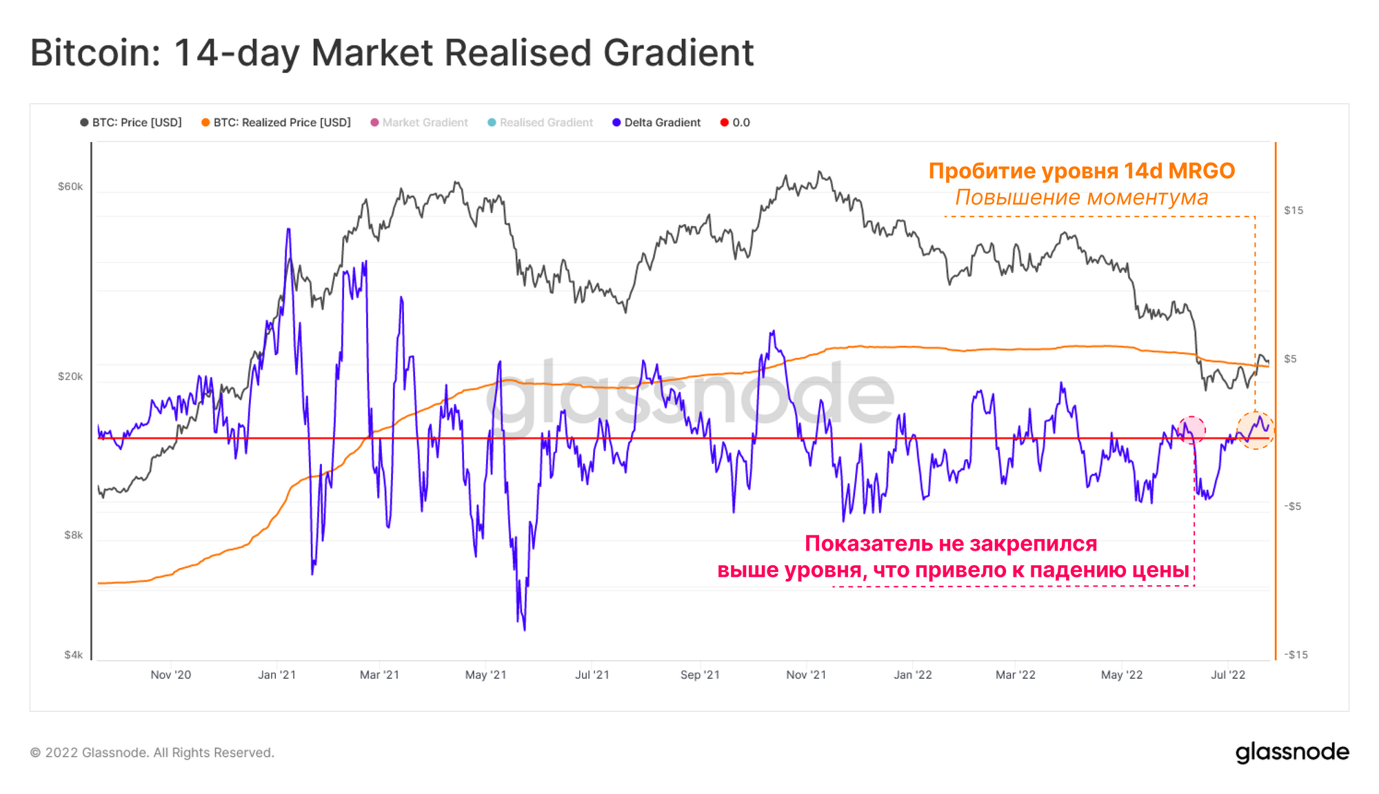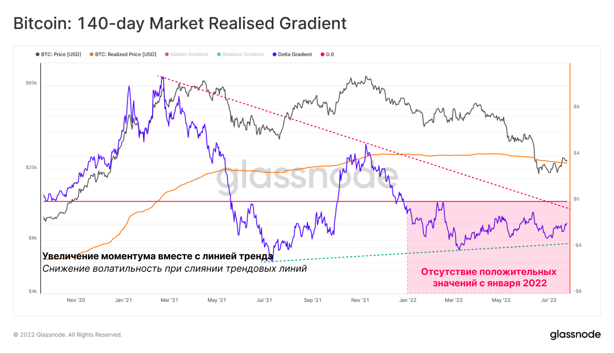 Через призму 140-дневного MRGO распродажа в мае 2021 года остается самым серьезным изменением моментума в этом цикле. Однако, как обсуждалось в выпуске "Медвежий тренд исторических масштабов", недавние распродажи в мае (LUNA) и июне 2022 года можно считать одними из крупнейших за всю историю наблюдений. Это указывает на то, что на макроуровне степень негативного рыночного моментума со временем уменьшается. Это может сигнализировать об истощении продаж, что предполагает, что на горизонте намечается стабилизация.