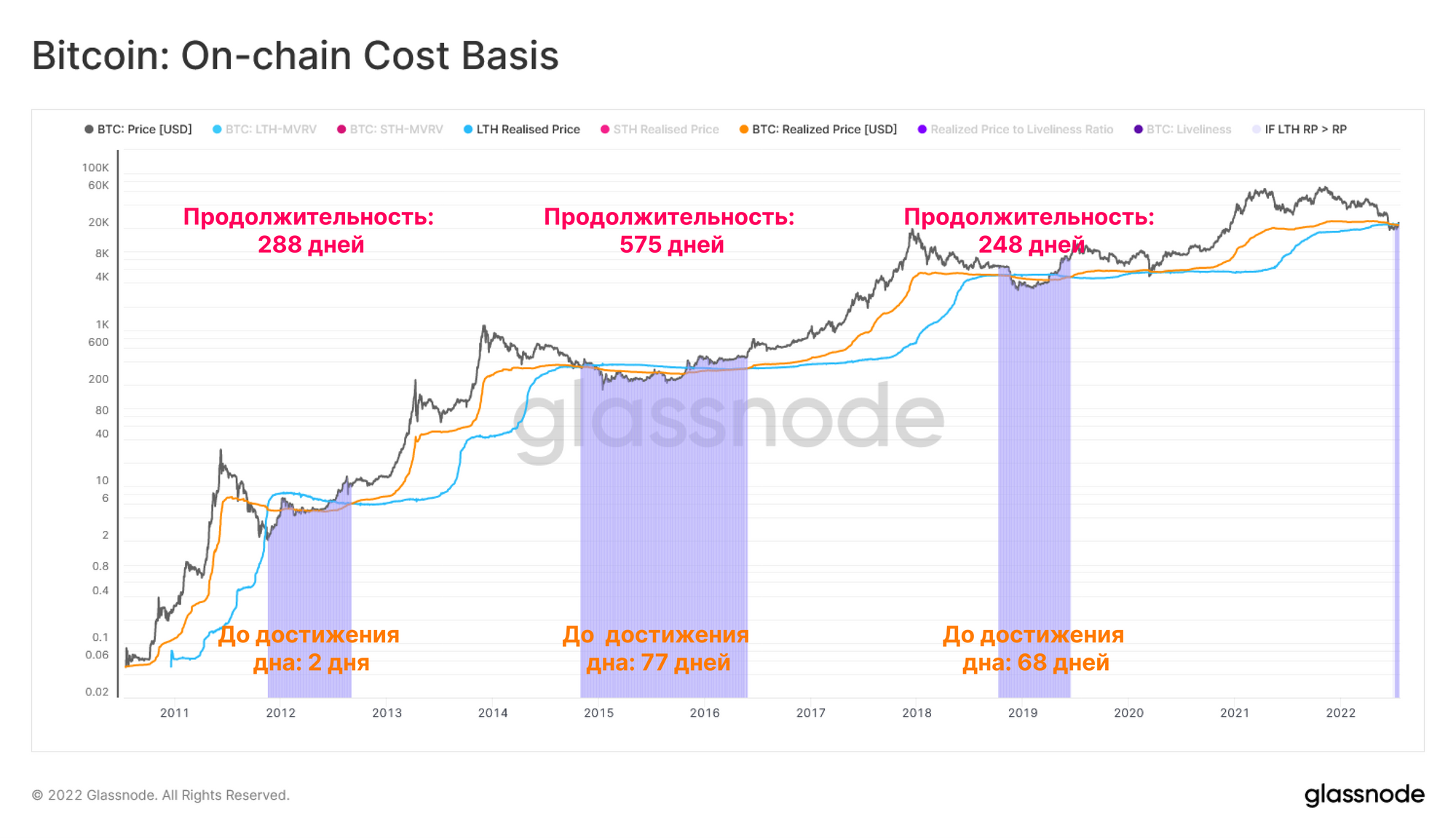 Реализованная цена же обычно растет в результате реализации прибыли. По мере того, как рынок достигает дна, укрепляется и появляется достаточный спрос, чтобы поглотить фиксацию прибыли, Реализованная поднимается выше Цены реализации долгосрочных холдеров.