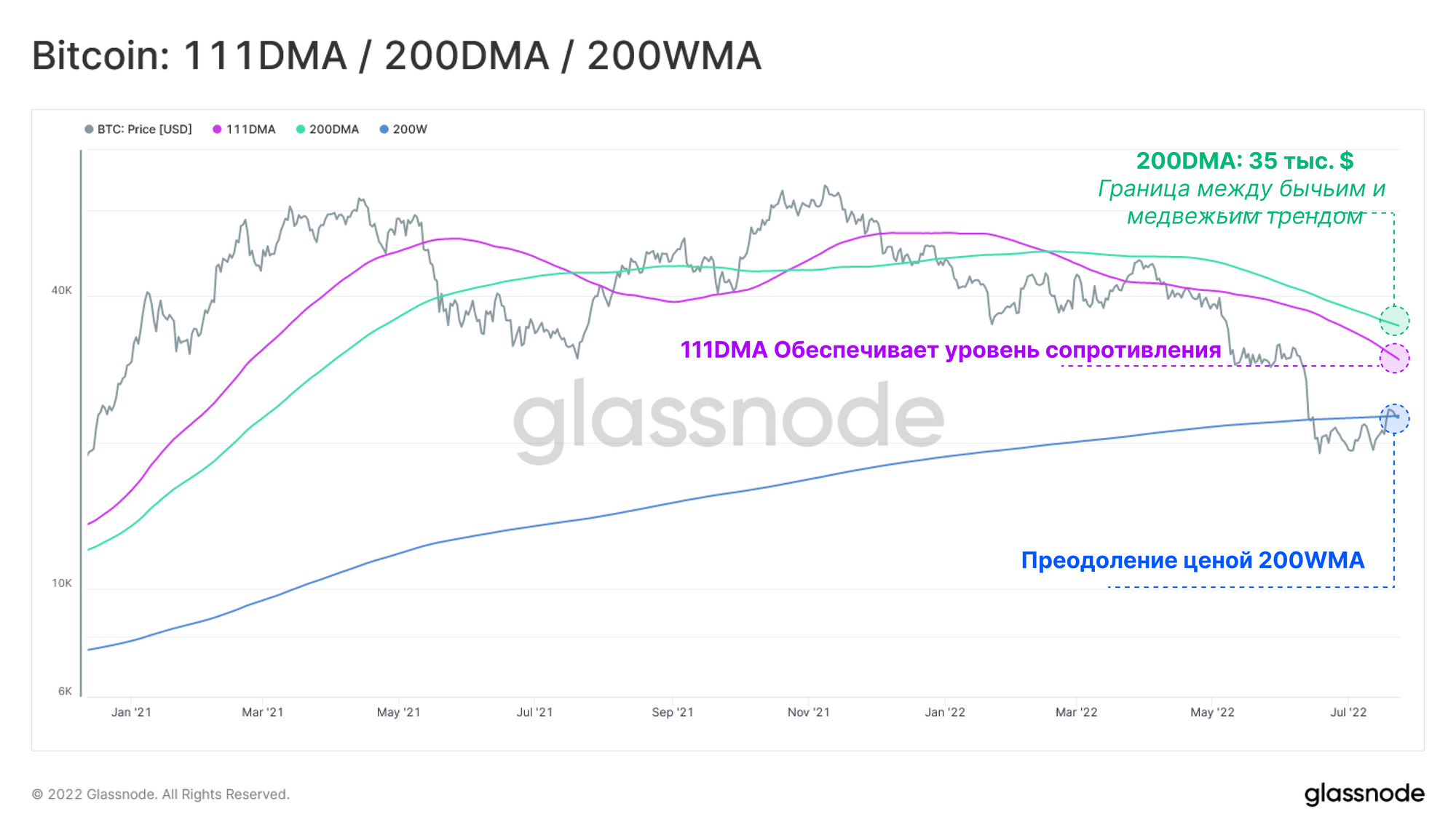 - 111DMA (111-дневная скользящая средняя) является компонентом индикатора Pi Cycle Top и в настоящее время находится на уровне 30 тыс.$, что соответствует психологическому уровню цен и концентрации предложения, описанным выше.