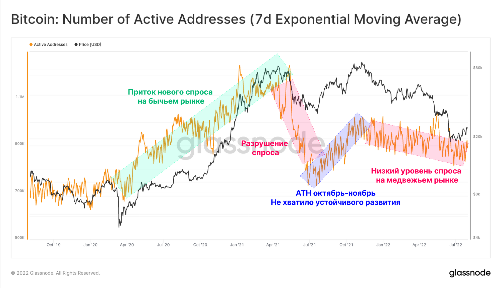 Обратите также внимание на то, что ATH в октябре-ноябре 🔵 достиг более низкого пика, чем ATH в апреле 2021 года, что говорит о том, что произошел серьезный отток пользователей и приток спроса не последовал.