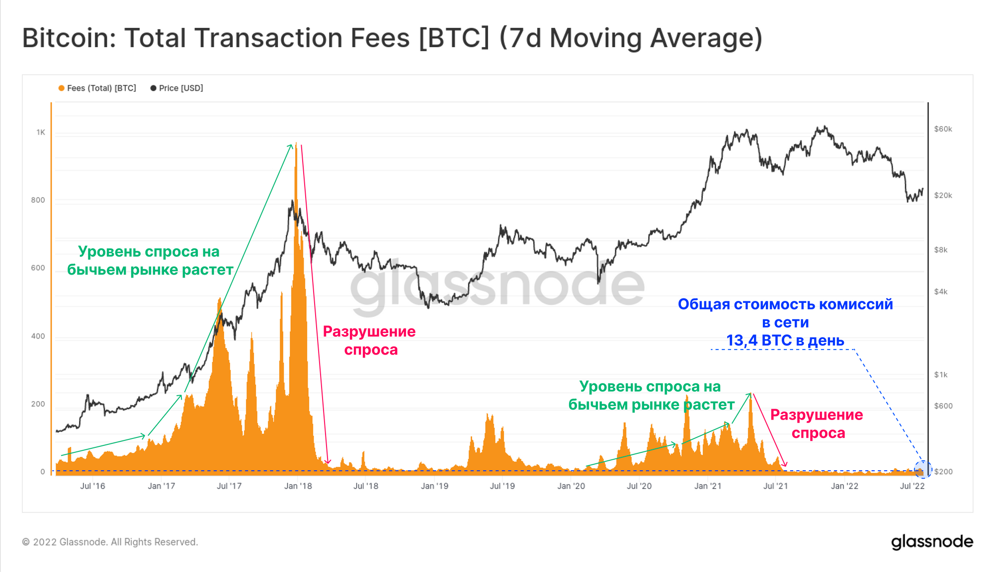 В результате слабого спроса, транзакции в сети находятся на территории медвежьего рынка 🔵, общая сумма комиссии, уплачиваемой в день, составляет всего 13,4 BTC. Подобным образом, как и в случае с активными адресам и спросом на транзакции, в мае 2021 года наблюдалось разрушение спроса 🔴 , когда снизилась загруженность сети, а комиссии начали формировать базовый уровень медвежьего рынка.