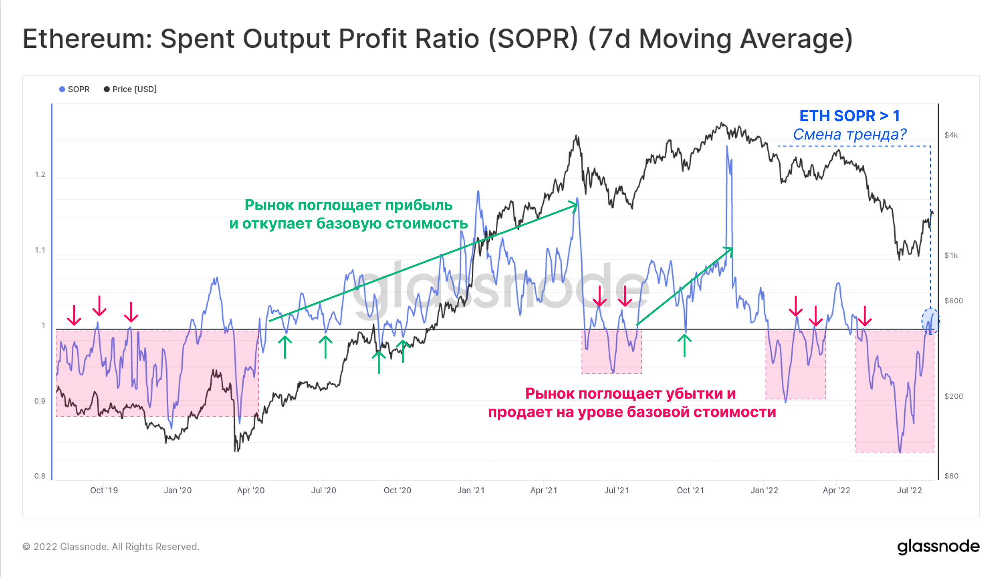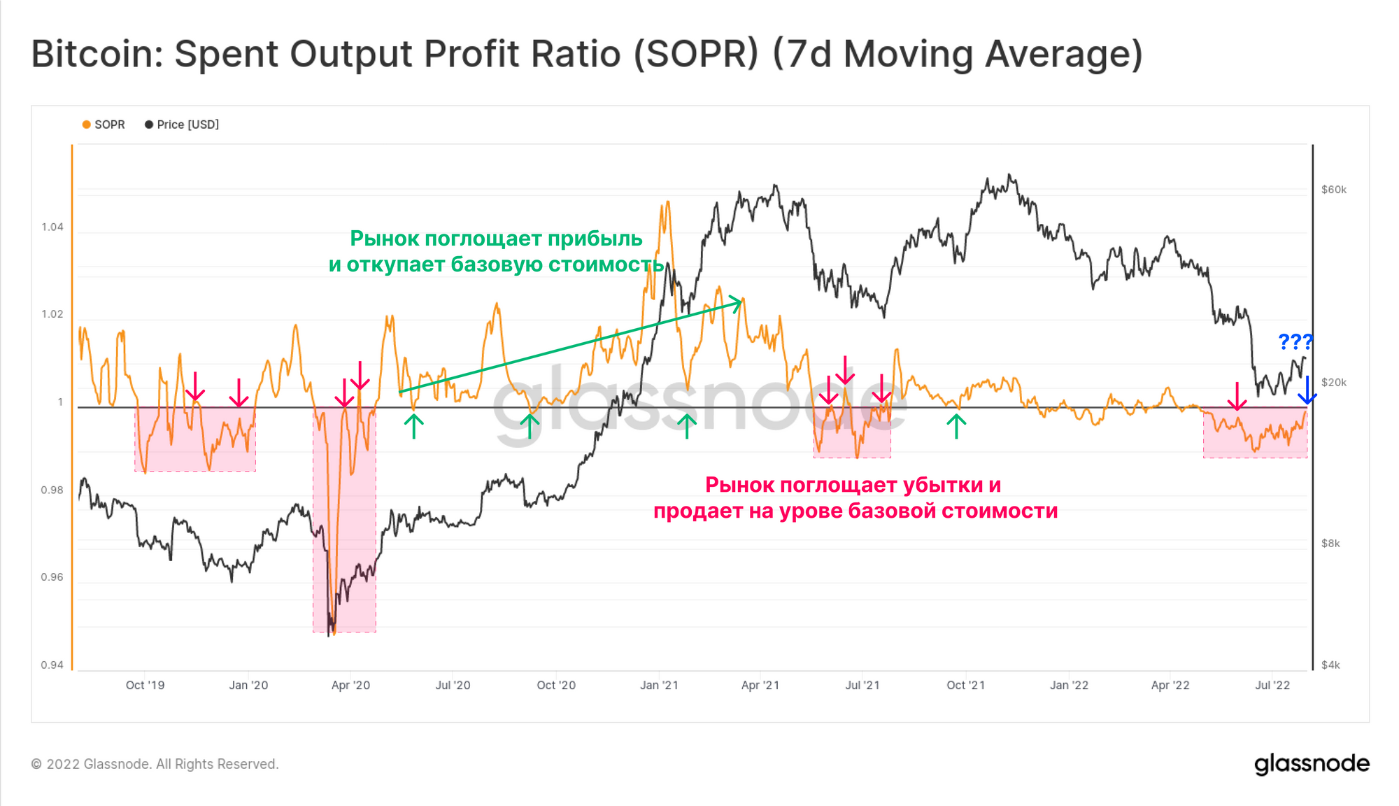 Для Биткойна SOPR пытается пробиться выше 1.0 во второй раз с начала июня. Обычно рынку требуется несколько попыток, прежде чем может быть достигнута скорость выхода из зоны. Идеальным бычьим сценарием был бы прорыв выше 1.0, а затем повторное тестирование, поиск уровня поддержки.