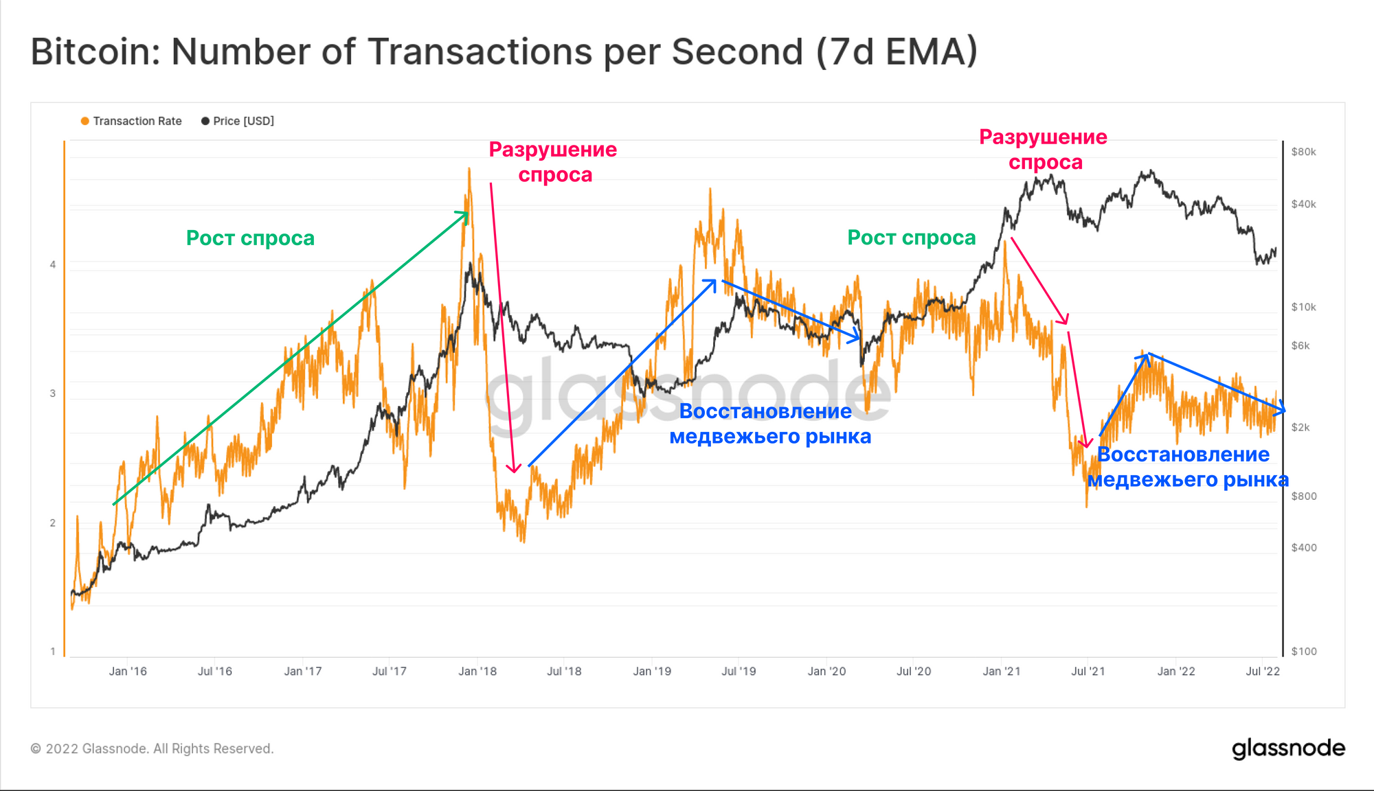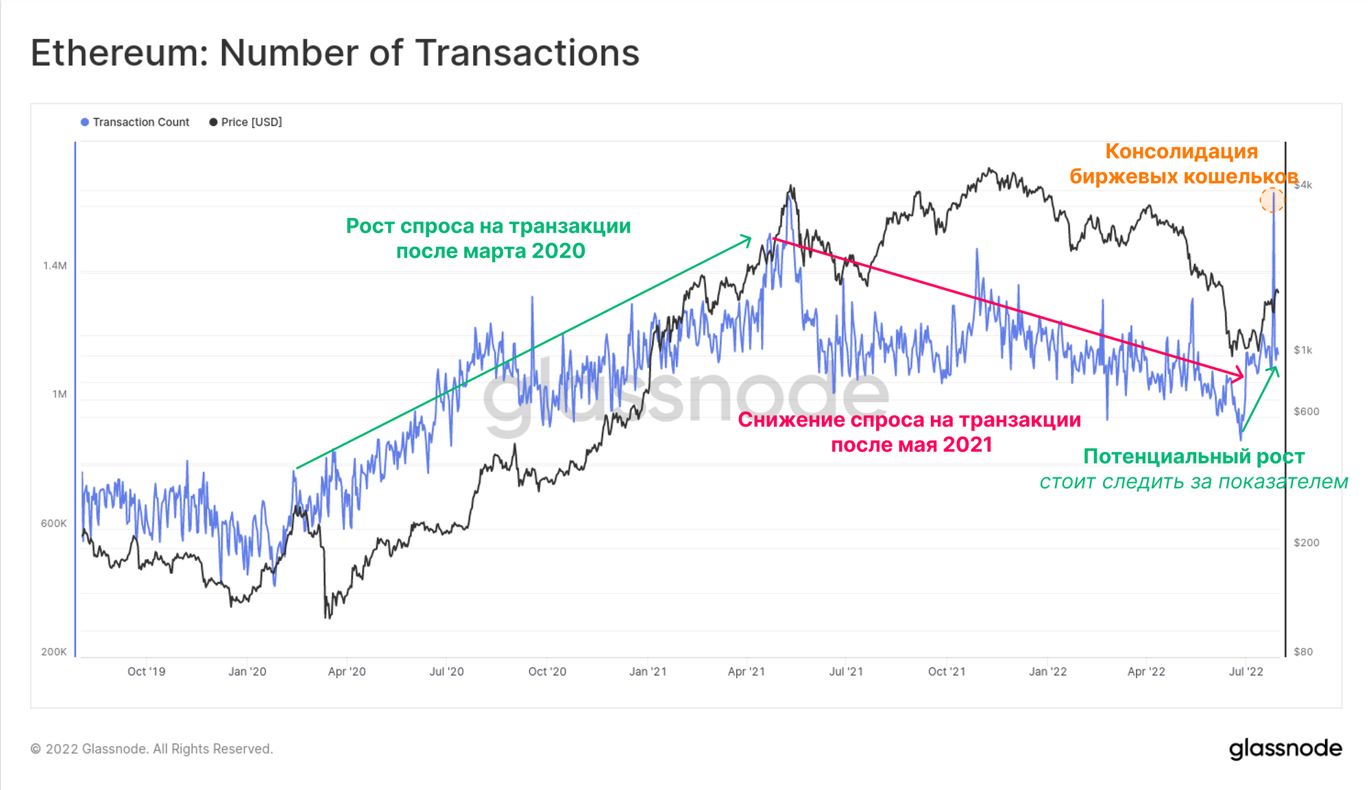 Спрос на транзакции в Эфире постепенно снижался после распродажи в мае 2021 года, наблюдался лишь короткий всплеск активности в последние недели. Если эта тенденция на повышение продолжится, она может закрепиться, поэтому за ней стоит следить.