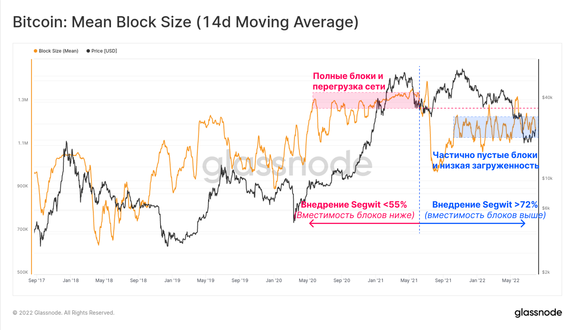 Обратите внимание, что SegWit - это технологическое обновление Биткойна, которое направлено на увеличение максимальной пропускной способности биткойн-блоков. До июня 2021 года уровень внедрения SegWit был ниже 55%, что означало, что максимальная пропускная способность блока была меньше, чем сейчас. Однако, учитывая, что внедрение SegWit в настоящее время превысило 72%, пропускная способность блокчейна более эффективна, однако текущая загруженность еще ниже, чем в мае 2021 года.