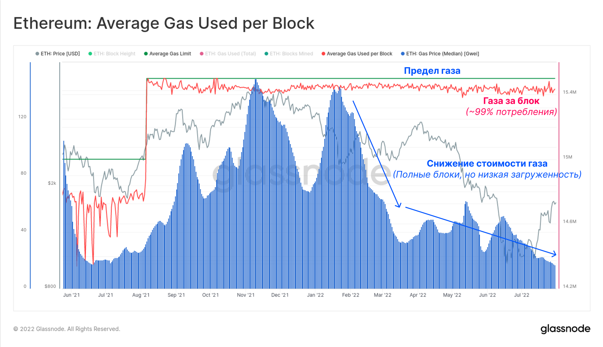 Эфир, как правило, имеет больший пул транзакций в мемпуле по сравнению с Биткоином, и в нем пространство блоков постоянно заполнено до >99% вместимости. В результате уплаченная цена на газ часто является отличным методом отслеживания реальных перегрузок.