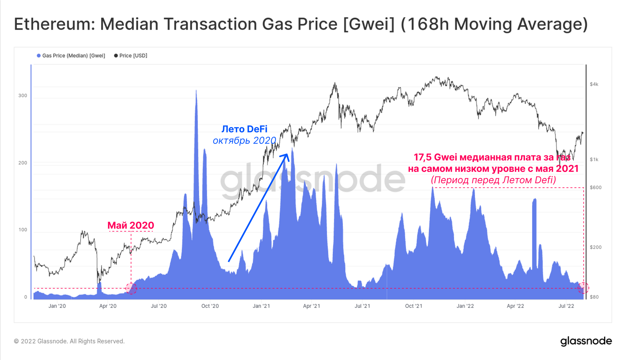 Недавно цены на газ в Эфире снизились всего до 17,5 Gwei в среднем за 7 дней. Это самая низкая загруженность сети и цена на газ с мая 2020 года, которая была до лета DeFi и до начала бычьего рынка.