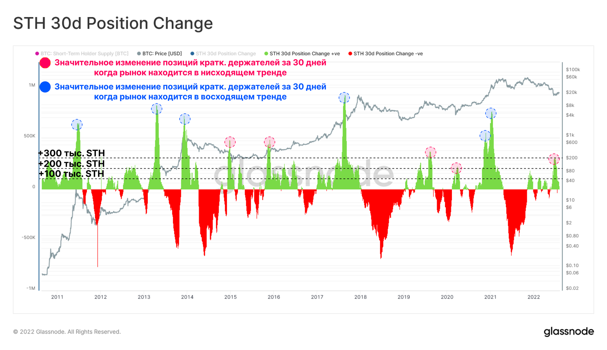 Экстремальное накопление Краткосрочными холдерами обычно сопровождается формированиями вершины бычьего рынка (отмечено 🔵), однако несколько примеров медвежьего рынка выделяются на фоне этой тенденции (отмечены 🔴):