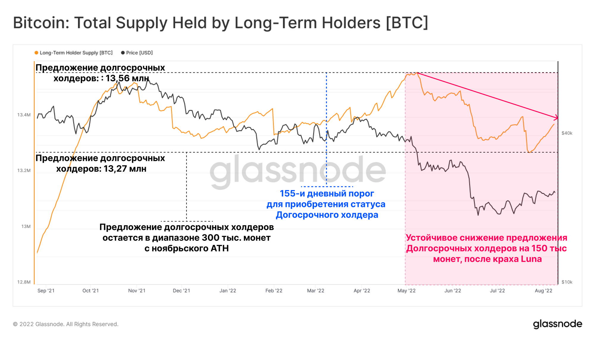 - С момента распродажи Luna в мае 2022 года, в группе Долгосрочных холдеров наблюдалось устойчивое снижение предложения на сумму около 150 тыс. BTC.