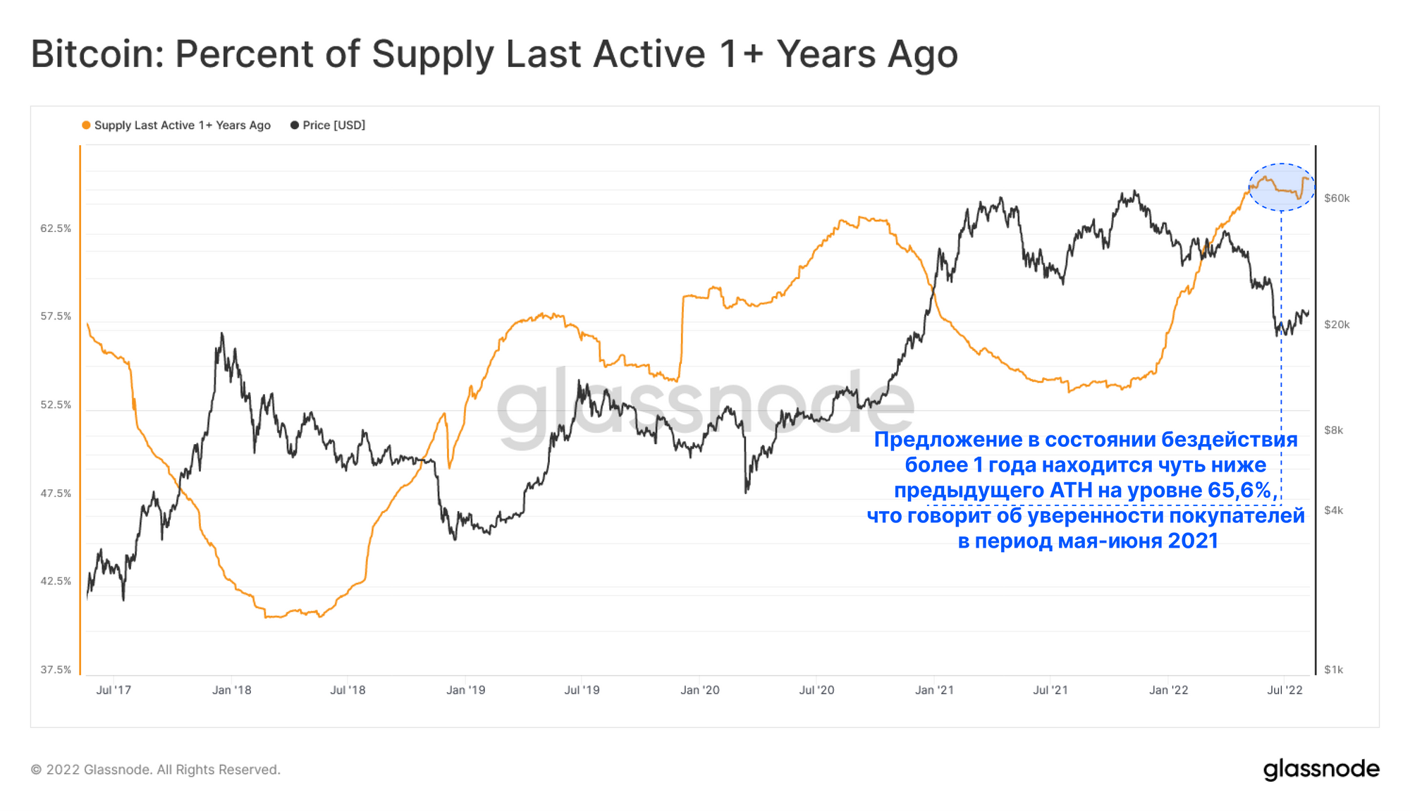 🔔 Обратите внимание: Процент предложения, которое было в последний раз активно более 1 года назад, выше 65,72% будет сигнализировать о новом ATH предложения, бездействующего в течение года, что предполагает повышенную вероятность формирования верхнего уровня рынка.