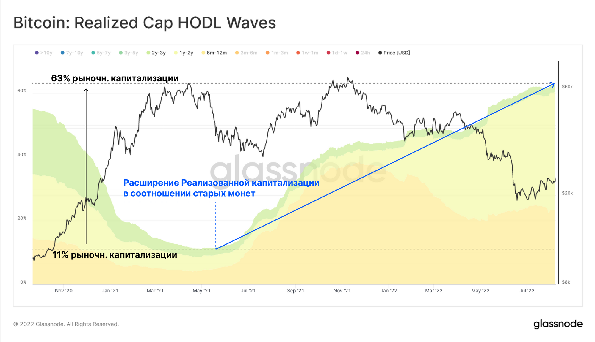 Реализованная капитализация волн HODL может быть использована для оценки ценности в долларах США, принадлежащего этим возрастным группам. Здесь мы можем увидеть еще более интересный результат, когда общая стоимость долларов США, удерживаемая в этих группах, выросла на 52%, что в настоящее время составляет 63% от Реализованной капитализации.