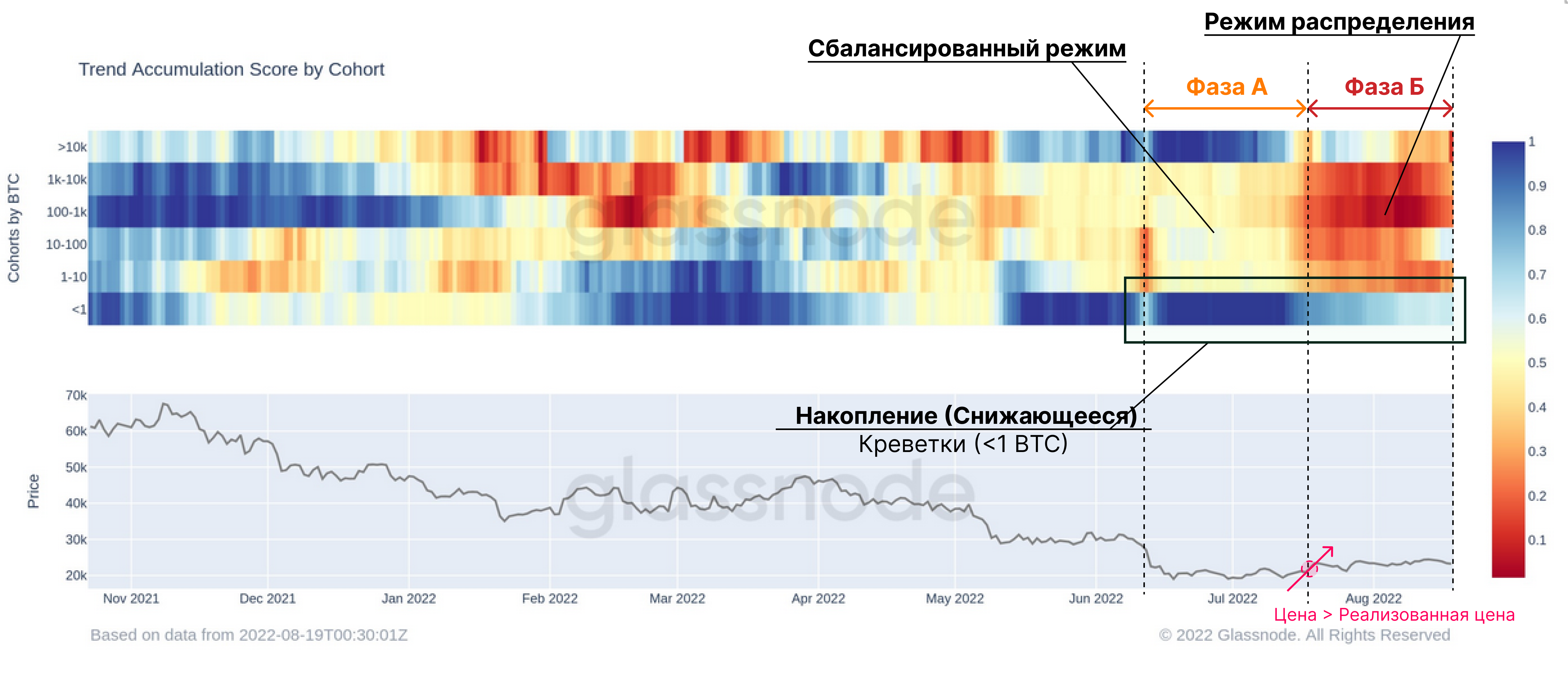- Фаза A 🟡: После падения ниже 20 тысяч долларов Креветки (< 1 BTC) и Киты (> 10 тысяч BTC, за исключением бирж и майнеров) перешли в стадию чистого накопления, в то время как другие классы инвесторов демонстрировали Сбалансированный режим.