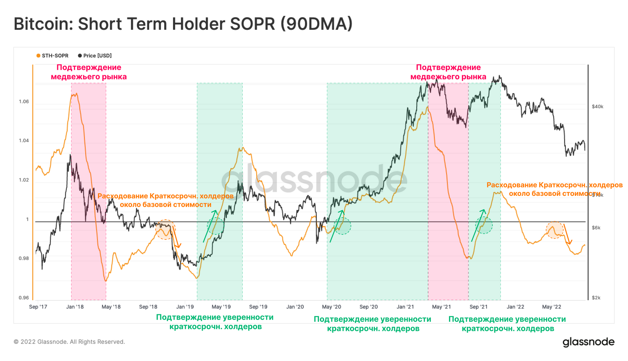 Наблюдение за сетевым спросом и активностью с акцентом на розничных инвесторах и спекулянтах позволяет выявить наиболее стадии неопределенности медвежьего рынка. Однако для того, чтобы пазл сложился в общую картину, мы завершим анализ оценкой Уверенности краткосрочных холдеров.