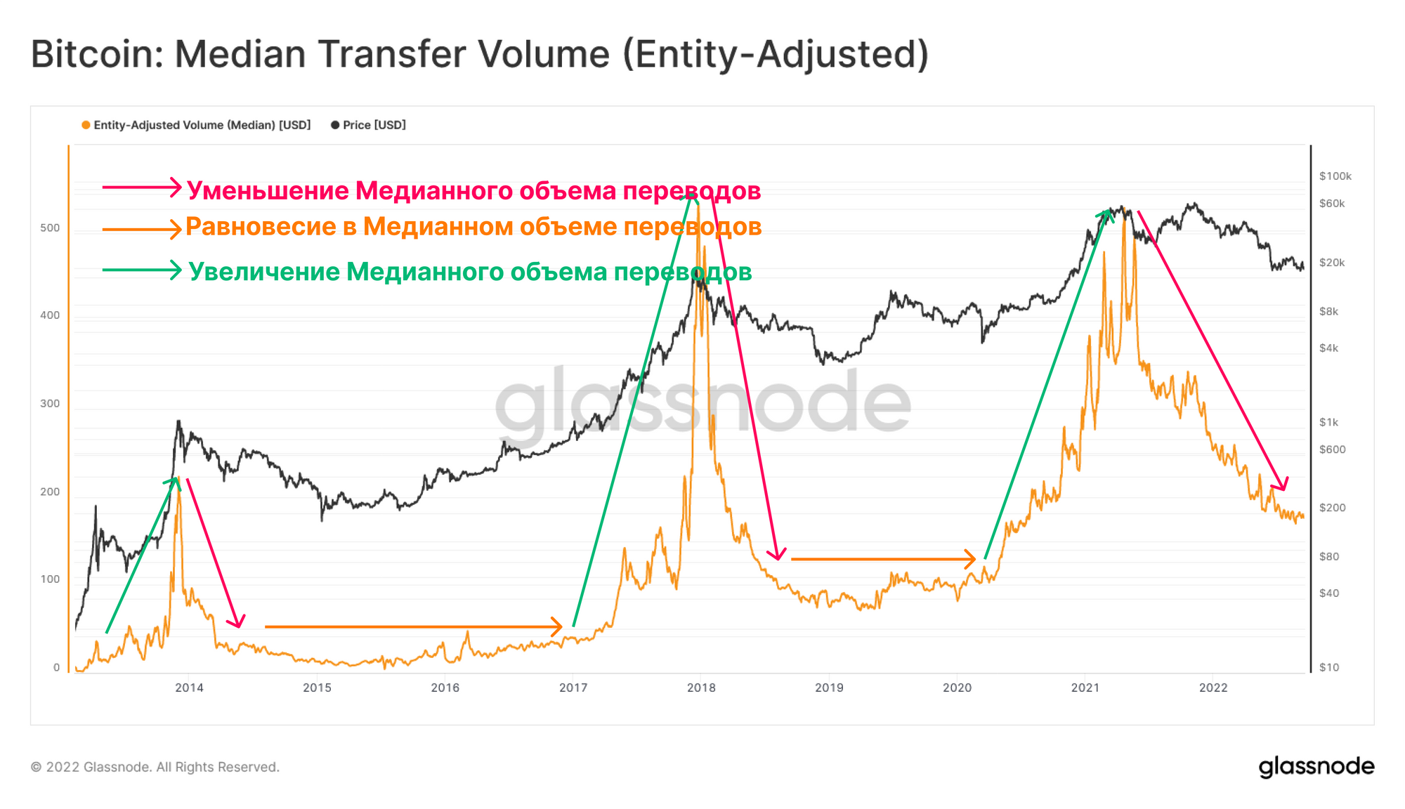 - Уменьшение Медианного объема переводов, как правило, означает снижение доли ритейл-инвесторов.