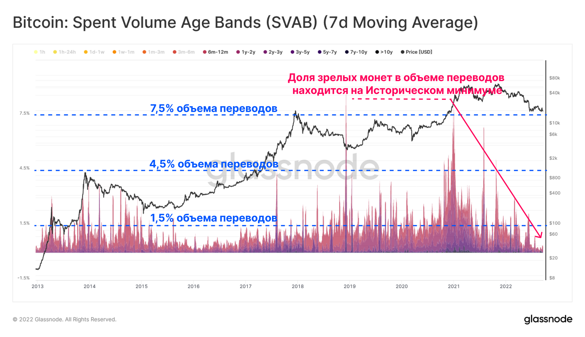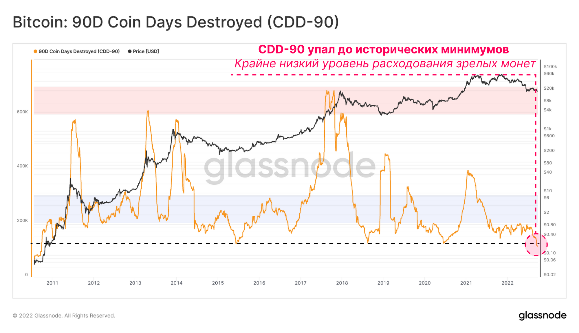 - Когда цены рухнули обратно до 20 тысяч долларов в 2022 году, рынок отреагировал противоположной реакцией - продолжительным периодом исключительно низкого расходования монет зрелого возраста, став фактически самым спокойным с момента минимумов медвежьего рынка 2018 года.