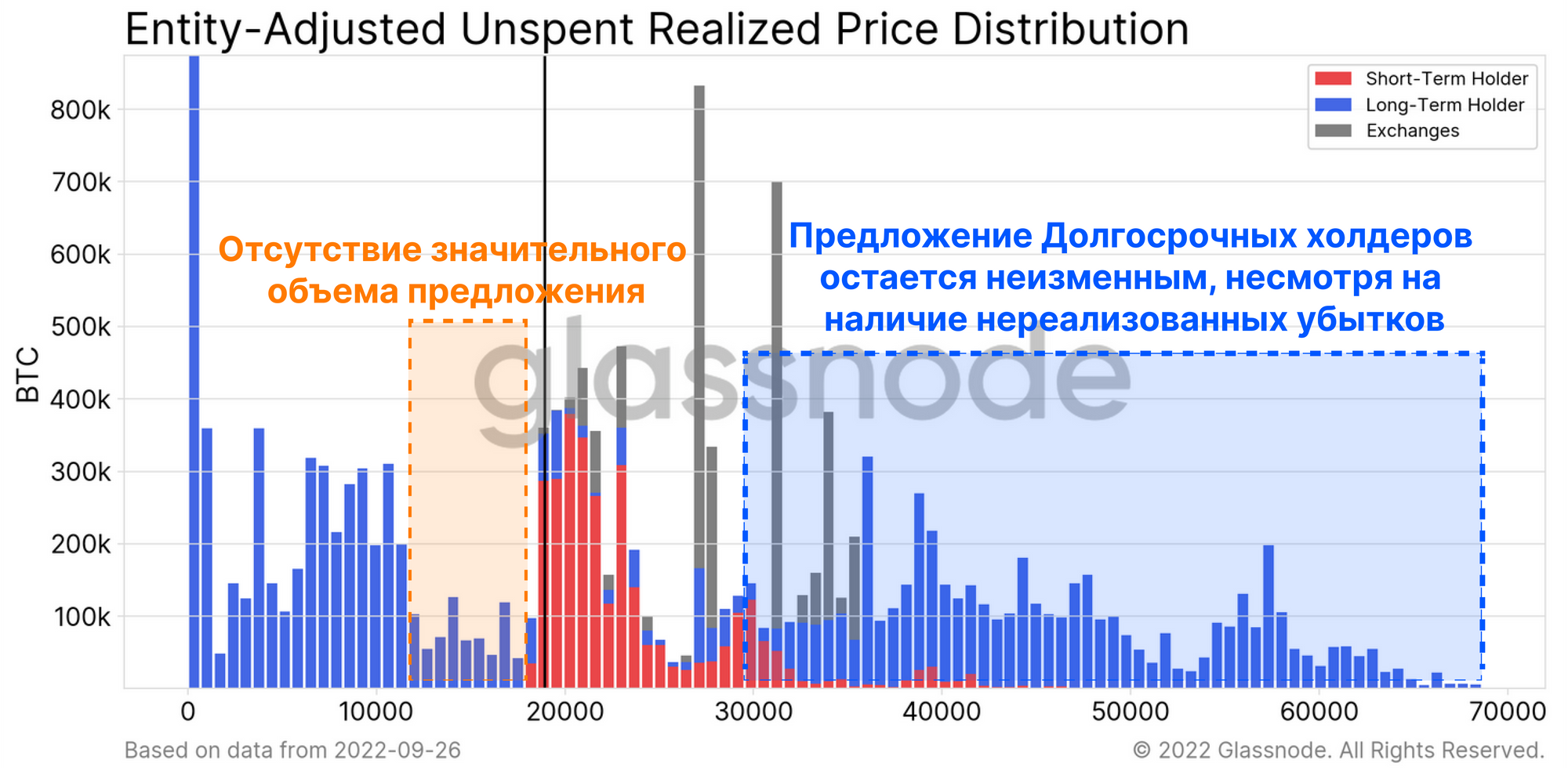 Группа долгосрочных холдеров, похоже, относительно не обеспокоена изменением цен в 2022 году, и их распределение предложения остается разумным. Напротив, группа краткосрочных холдеров отвечает за обращение большинства монет с высокой концентрацией вокруг текущей рыночной цены. Таким образом, именно группа Краткосрочных холдеров представляет наибольший интерес с этой точки зрения.