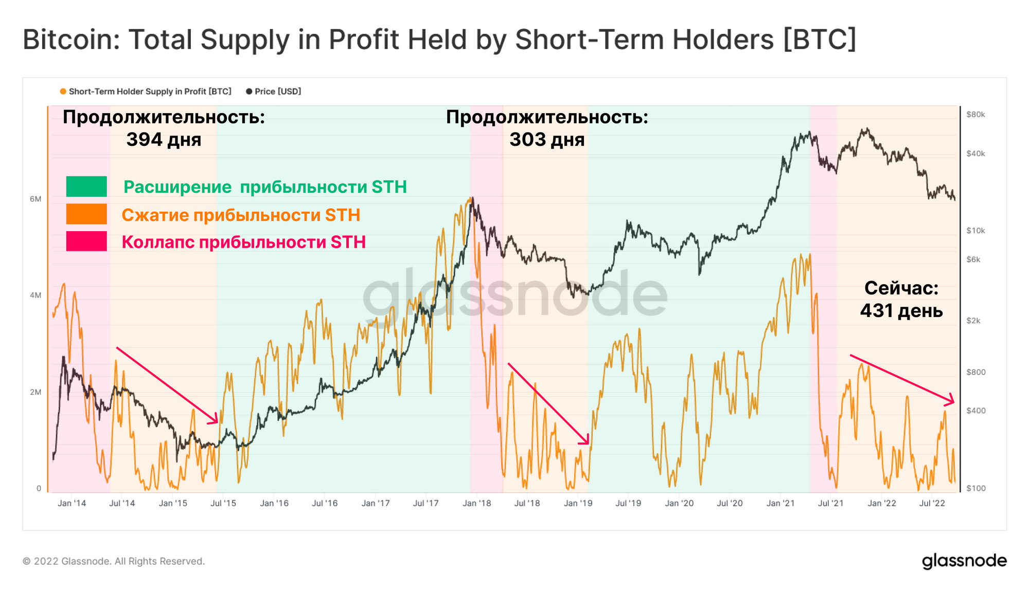 Прибыльность Краткосрочных холдеров остается глубоко внутри фазы 2 в течение 431 дня, являясь самым продолжительным периодом из всех циклов медвежьего рынка на сегодняшний день.