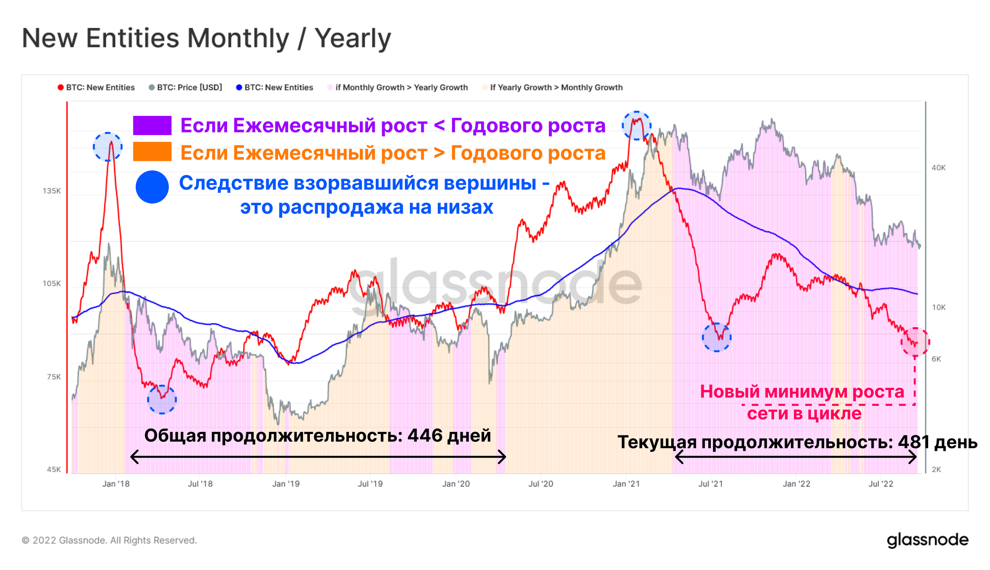 В текущем цикле снижение роста сети началось 533 дня назад, оно прерывалось на 52 дня в марте-апреле 2022 года. На медвежьем рынке 2018-20 годов наблюдалось еще несколько периодов восстановления уровня внедрения сети, особенно в середине 2019 года, когда цена выросла до 14 тысяч долларов.