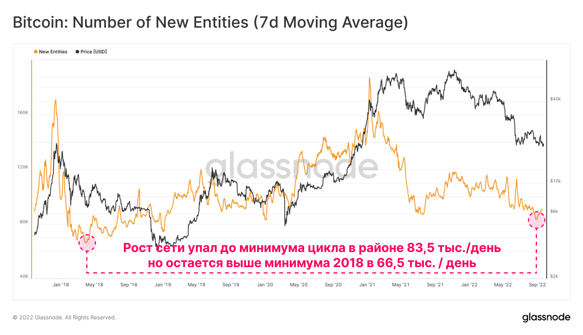 Для начала, мы рассмотрим показатель Новых субъектов, отражающий степень внедрения сети и позволяющий дать приблизительную оценку количества новых уникальных субъектов, которые совершали транзакции в сети Биткоиин. Мы можем увидеть, что в день к сети подключаются около 83,5 тыс. Новых Субъектов, что является новым минимумом для цикла 2020-22 годов, но остается выше минимума медвежьего рынка 2018 года, когда минимальный приток составлял 66,5 тыс. Новых Субъектов в день.