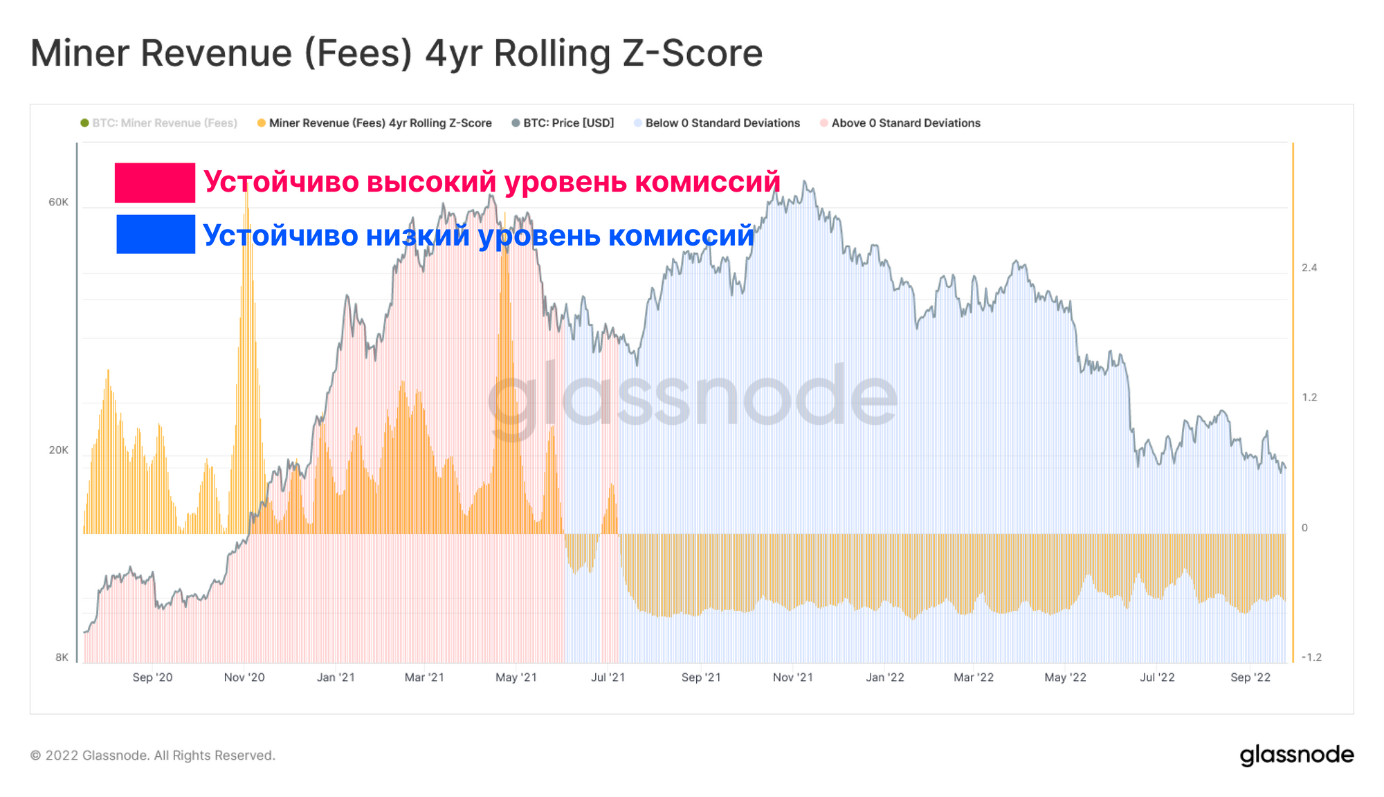 - Устойчиво низкий уровень комиссий указывает на отсутствие спроса на блокчейн, минимальную загруженность сети.
