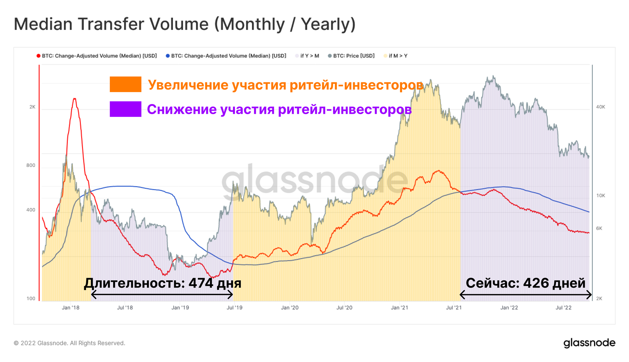 После Великой миграции майнеров можно наблюдать период вытеснения ритейл-инвесторов 🟪, который продолжается уже 426 дней. Подобная продолжительность вытеснения с рынка ритейл-инвесторов наблюдалась в период медвежьего рынка 2018 года, которая продолжалась 474 дня, прежде чем среднемесячный показатель восстановился выше уровня среднегодового.