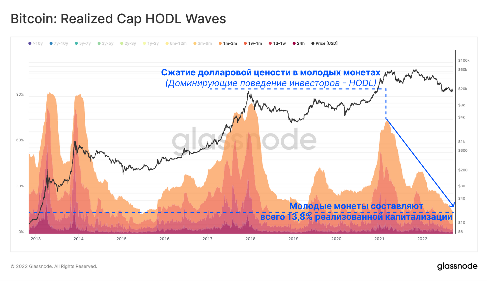 Этому настроению соответствует показатель Реализованной капитализации Волны HODL, который отображает ценность в долларах США, принадлежащее отдельным возрастным группам монет. В условиях, когда расходы зрелых монет сильно снижены, степень холдинга исторически высока.