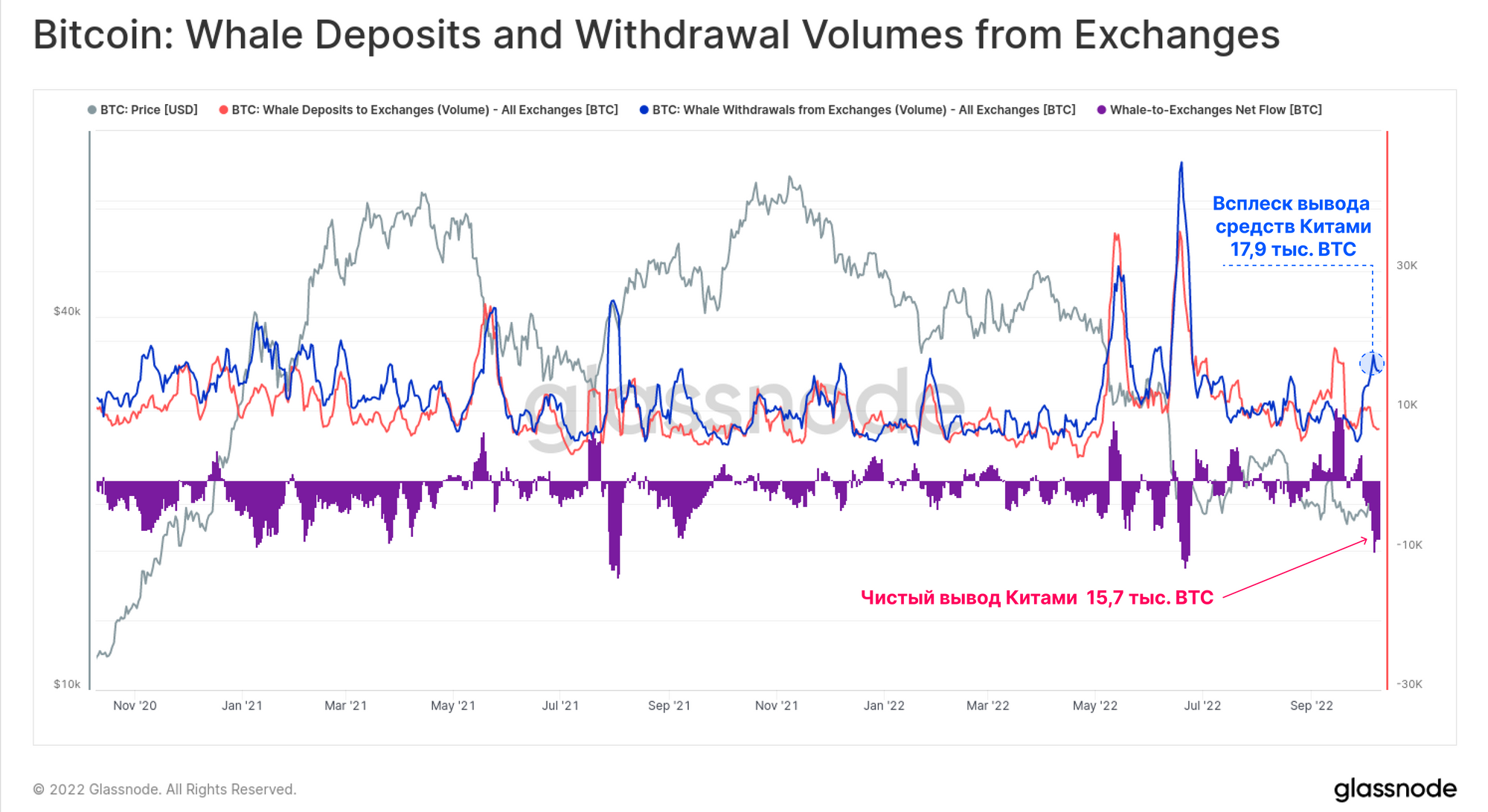 В последние недели мы наблюдаем увеличение чистых объемов вывода биткоинов Китами, при этом чистый отток с бирж достиг 15,7 тыс. BTC, что является крупнейшим показателем с июня 2022 года.
