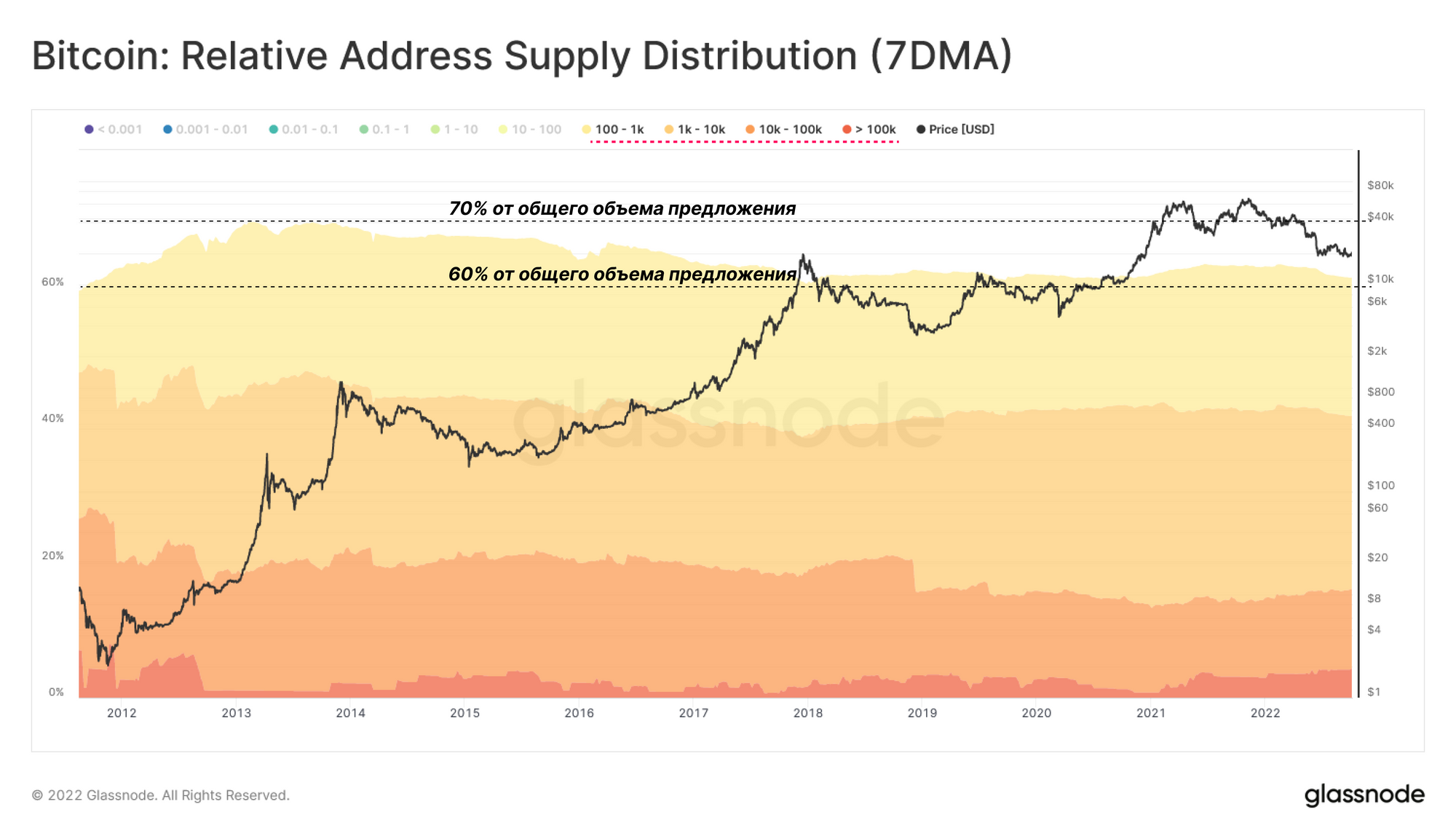 Значимость крупных субъектов можно оценить по их доле в общем циркулирующем предложении. Как показывает график Распределения относительного предложения адресов, доля крупных адресов (содержащих > 100 BTC) постепенно снизилась с 70% до 60% от общего предложения с начала 2011 года (однако стоит отметить, что стоимость монеты значительно изменилась за это время).