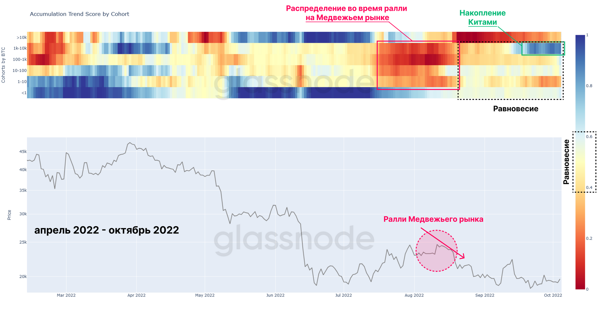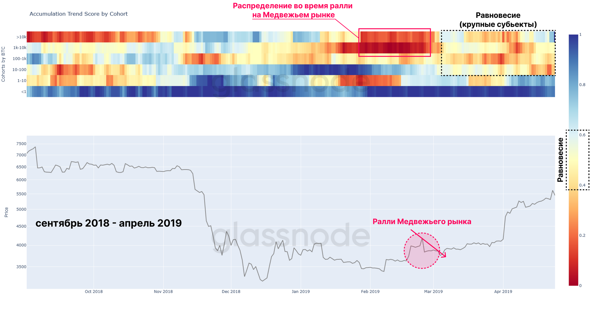 Как правило, устойчивый ценовой импульс часто может быть связан с поддерживающим трендом в чистом он-чейн накоплении или распределении. Эта корреляция часто в наибольшей степени определяется поведением наиболее крупных инвесторов (например, лиц с высоким уровнем собственного капитала, Китов и институционального капитала).